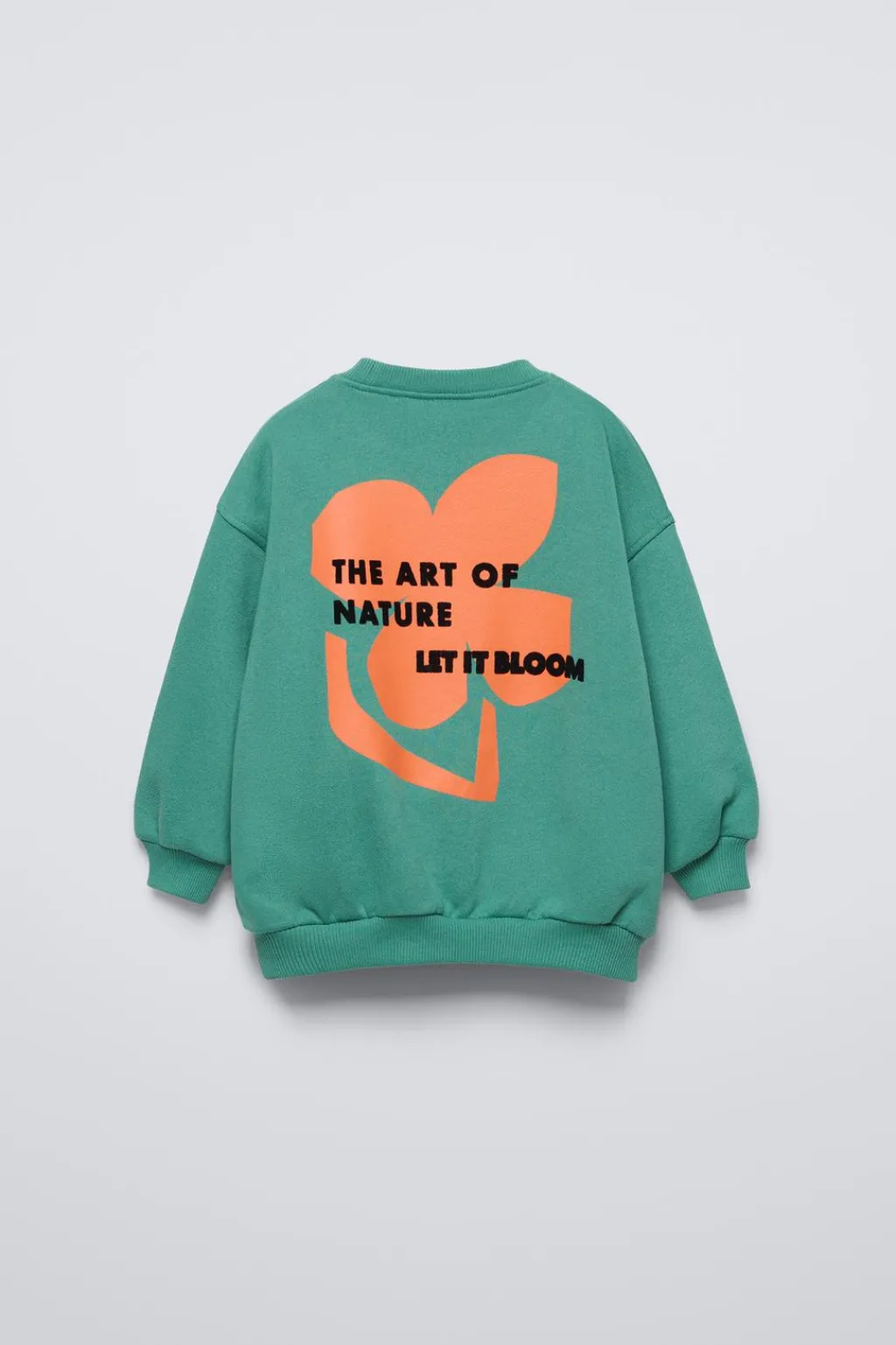 Sudadera con cuello redondo y manga larga. Acabados en rib. Estampado en pechera y espalda con detalle flock.