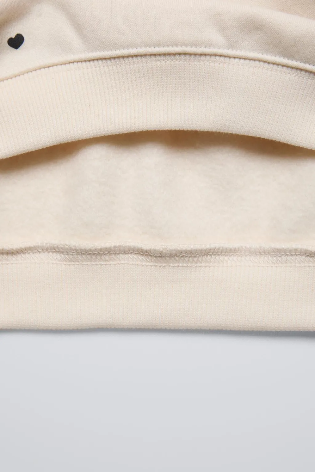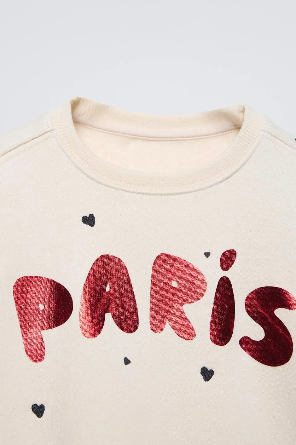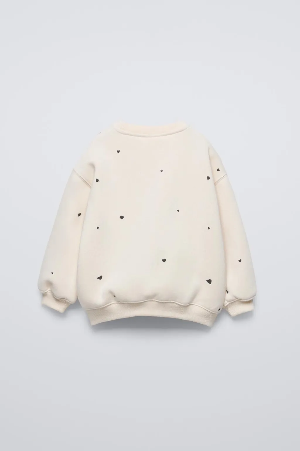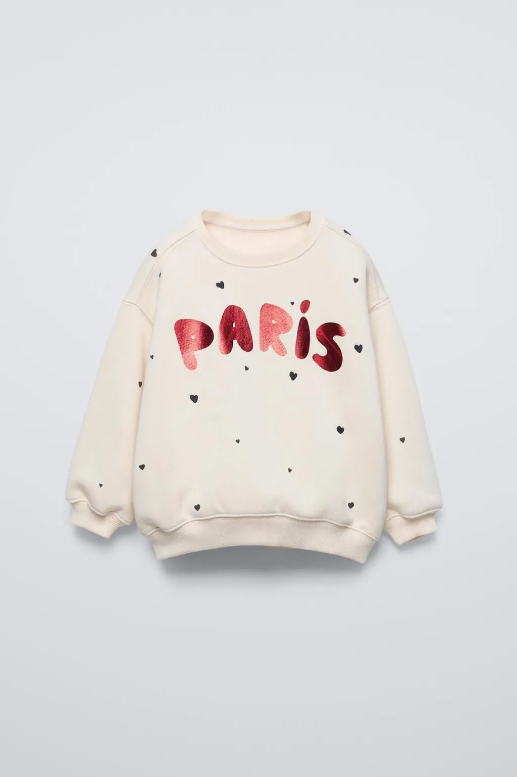 Sudadera con cuello redondo y manga larga. Acabados en rib. Estampado texto con detalle brillo en pechera y corazones bordados. Calidad interior cálida y suave.