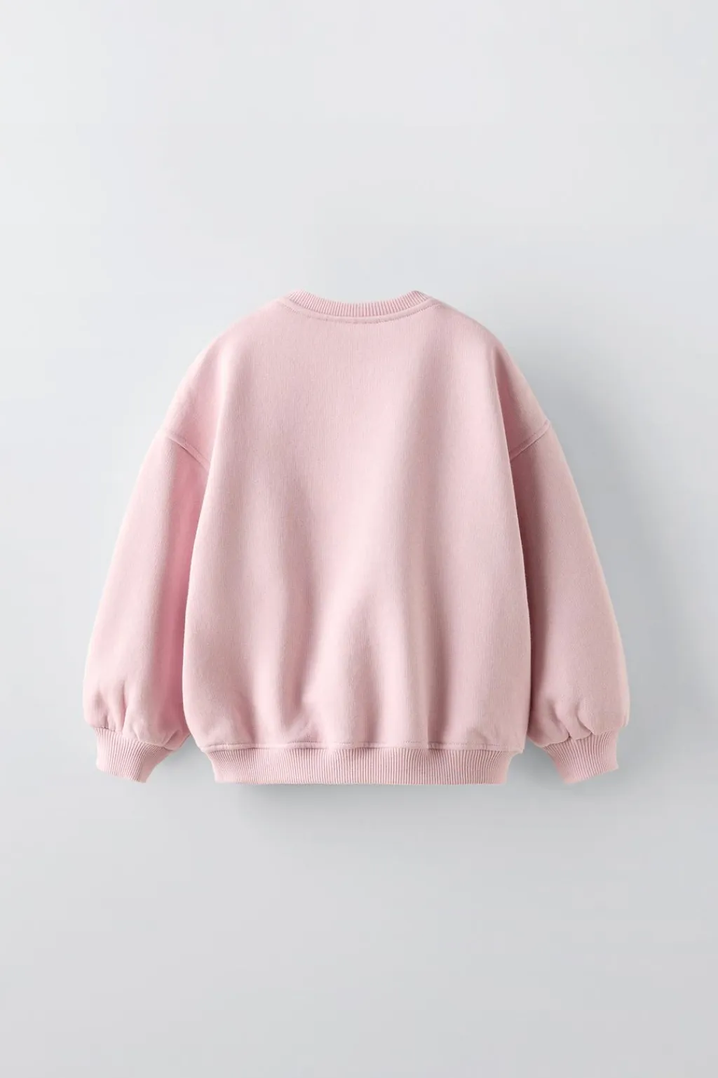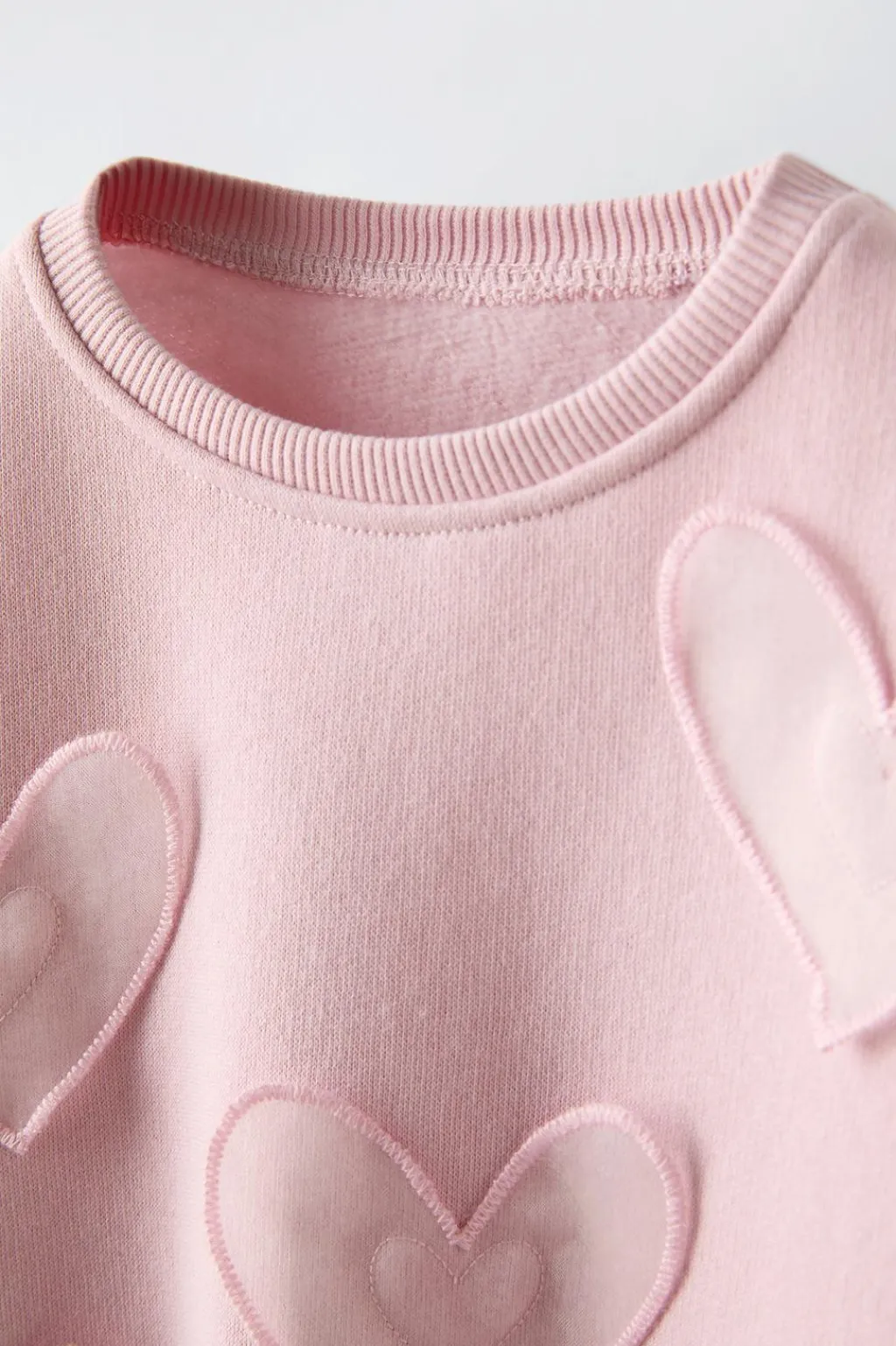 Sudadera con cuello redondo y manga larga. Acabados en rib. Aplique corazones organza en delantero.