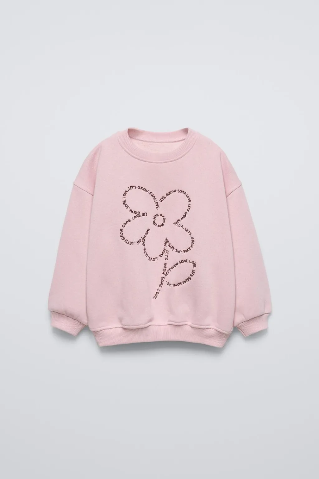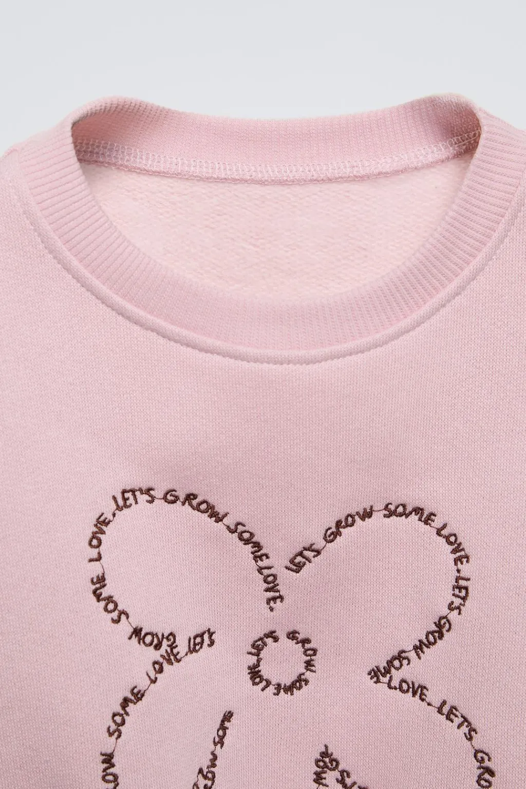 Sudadera con cuello redondo y manga larga. Acabados en rib. Detalle texto bordado en forma de flor en delantero. Calidad interior cálida y suave.