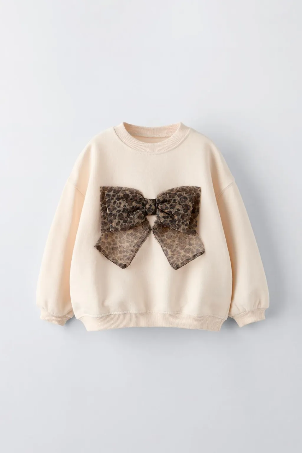 Sudadera con cuello redondo y manga larga. Acabados en rib. Aplique lazo tul con animal print en delantero.