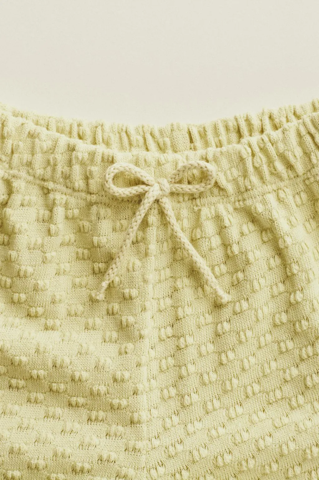 Bermuda en un tejido de punto «pop corn» con algodón. La cinturilla elástica aporta comodidad y tiene un lazo como detalle.