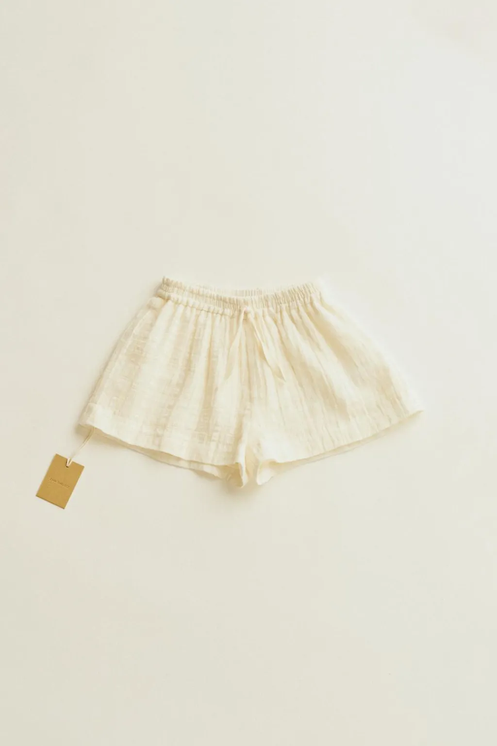 Bermuda con fit amplio confeccionada en un tejido ligero de algodón con textura. La cinturilla elástica la hace una prenda cómoda y tiene un lazo como detalle.