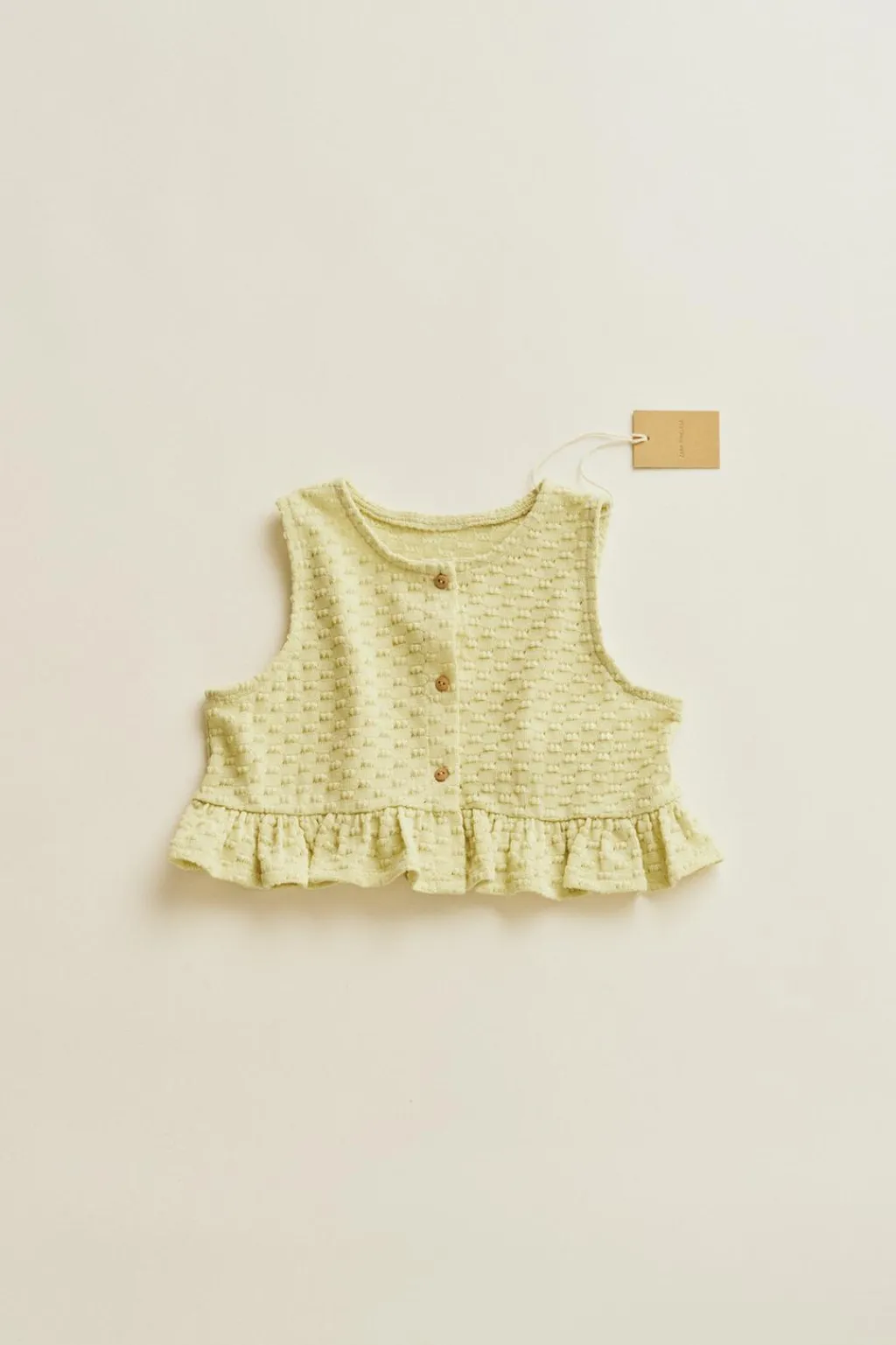 Top en un tejido de punto «pop corn» con algodón. Tiene unos botones de madera como cierre. El detalle está en el volante del bajo.