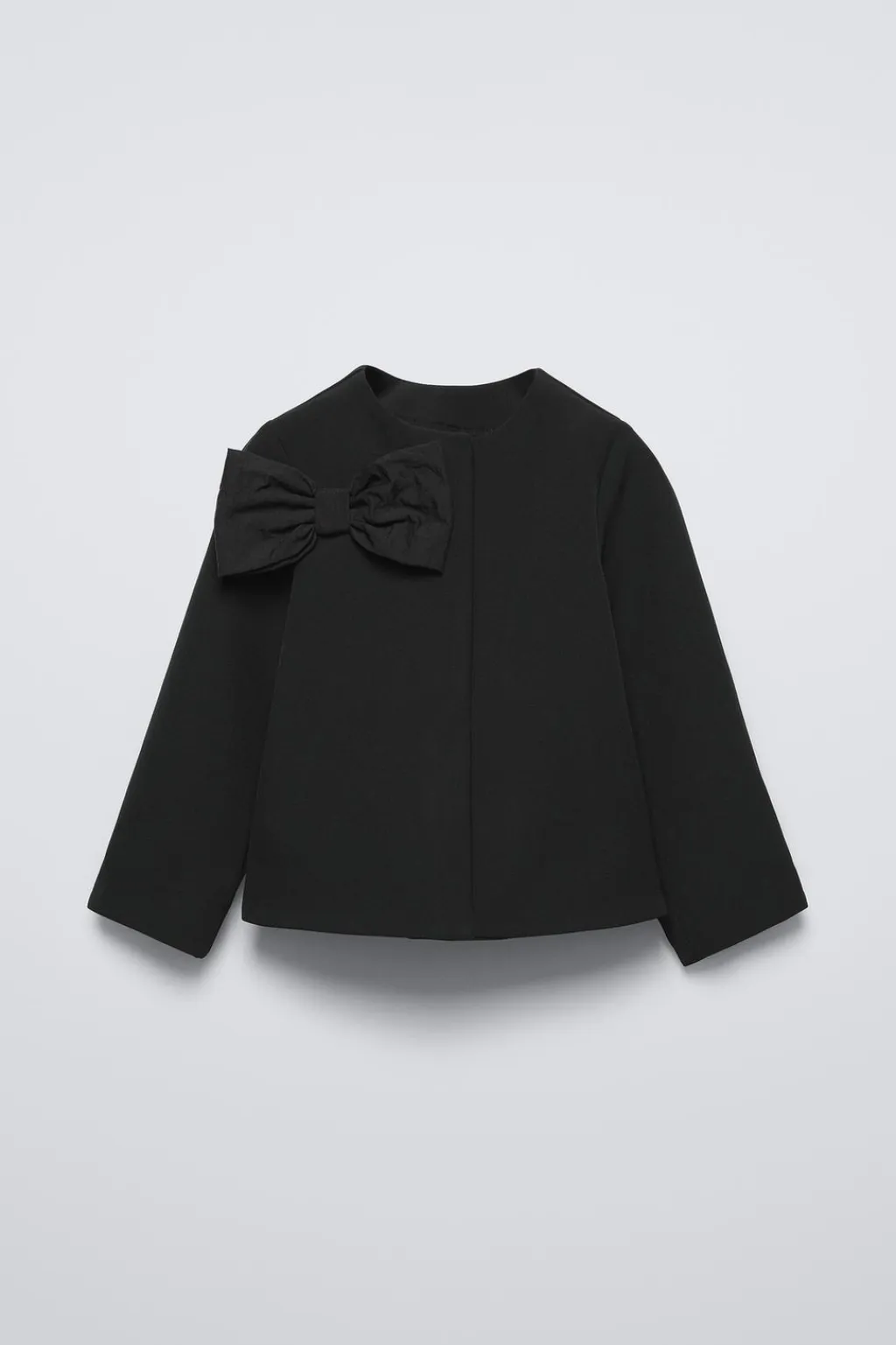Chaqueta con cuello redondo y manga larga. Cierre botones presión ocultos en delantero. Aplique lazo combinado en pechera.