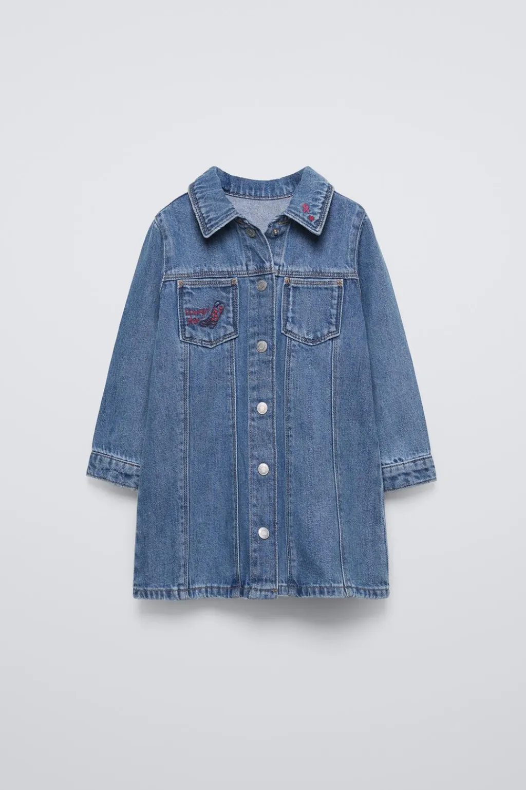 Vestido con cuello camisero y manga larga. Cierre botones de tipo presión frontal. Bolsillos de tipo plastrón en pechera. Detalle bordados en cuello y bolsillo.