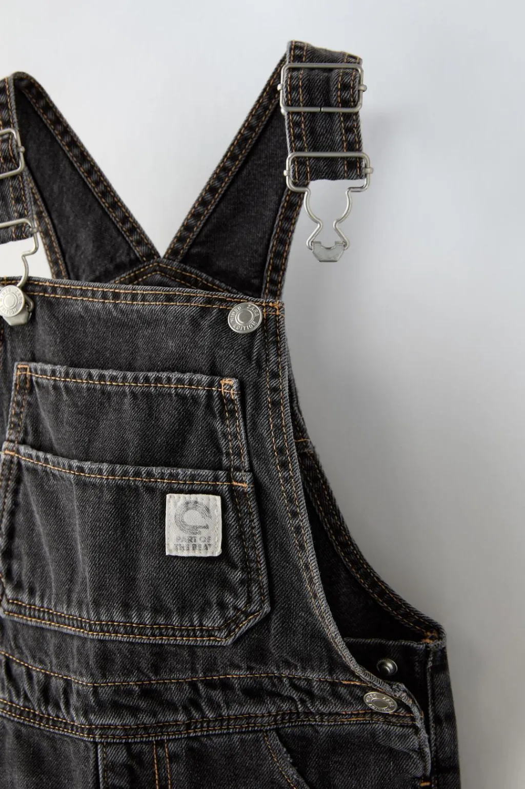 Peto con cuello recto y tirantes ajustables por jardineras frontal. Bolsillos delanteros, de tipo plastrón en pechera con aplique etiqueta y espalda. Cierre botón presión en laterales.