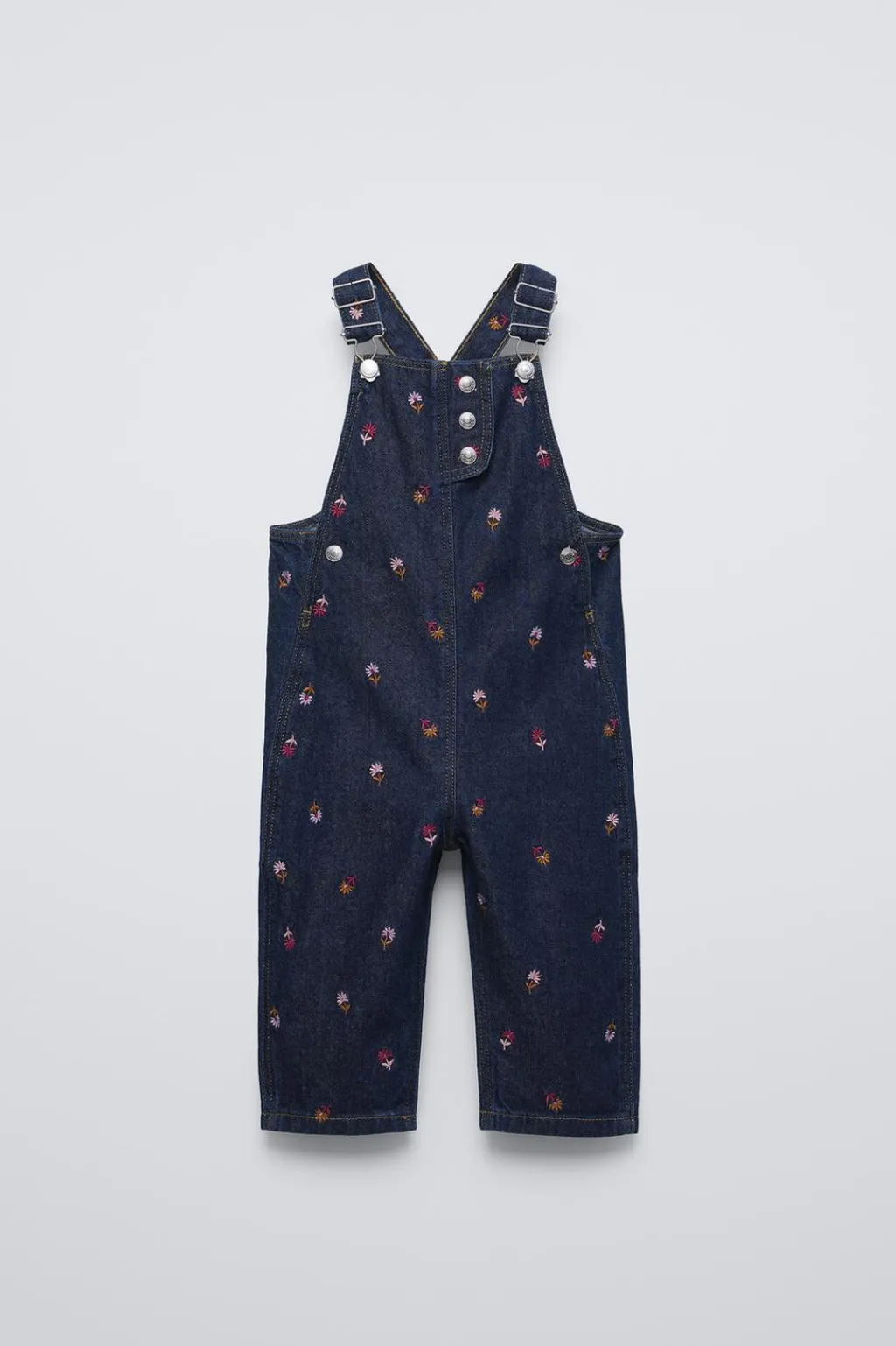 Peto denim largo con cuello recto y tirantes ajustables con cierrre jardineras. Aplique botones en canesú y cierre botones tipo presión en laterales. Detalle flores bordadas.