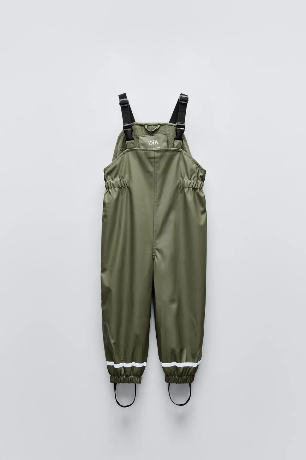 Peto engomado con cuello recto y tirantes ajustables elásticos. Detalle goma en cintura. Aplique cintas elásticas en bajo. Forro interior en tejido polar.