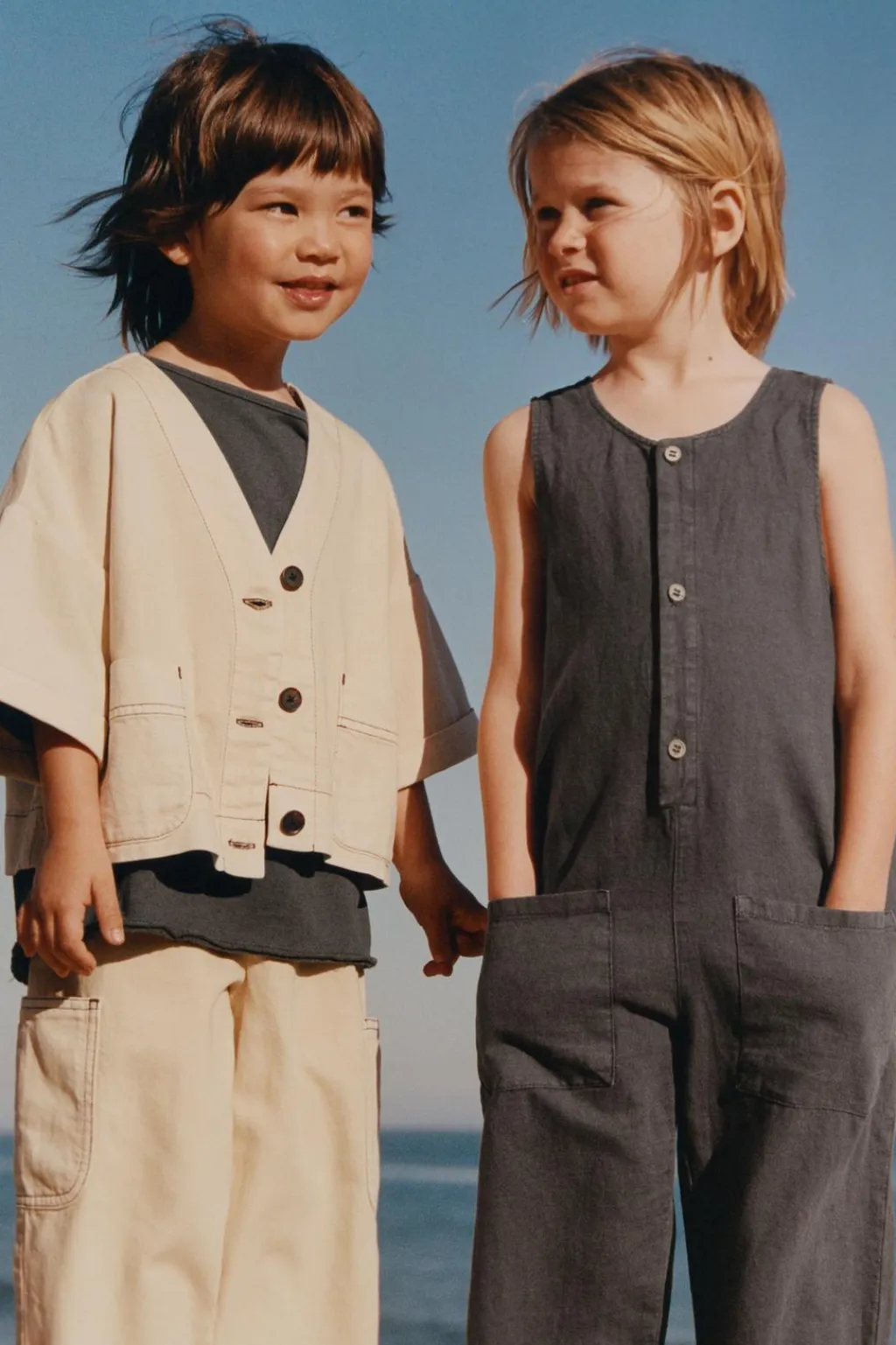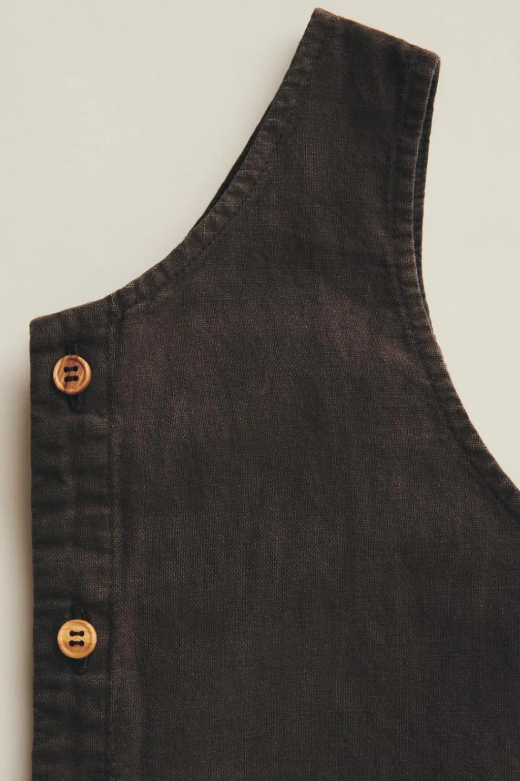 Mono sin mangas con fit relajado y atemporal. Confeccionado en un tejido ligero de mezcla algodón y lino. Unos botones en madera le dan un toque cálido a la prenda y tiene unos bolsillos frontales para darle un aire más casual.