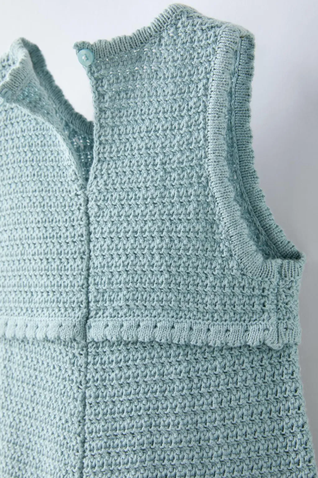 Peto con cuello redondo y manga sisa. Detalle flores bordadas en delantero. Cierre tipo lágrima con botón en espalda.