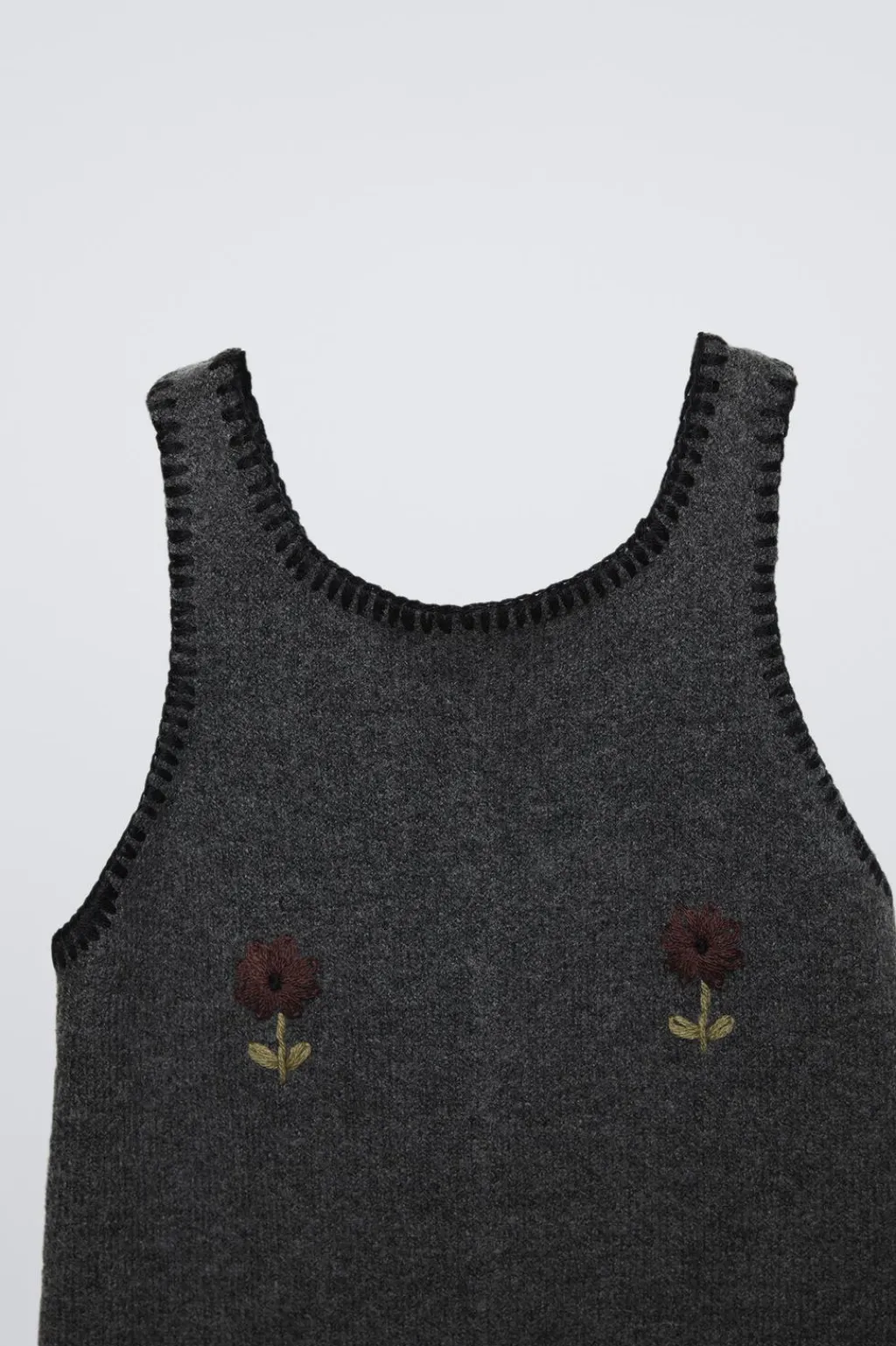 Peto de punto con cuello redondo y manga sisa. Detalle flores bordadas en delantero.