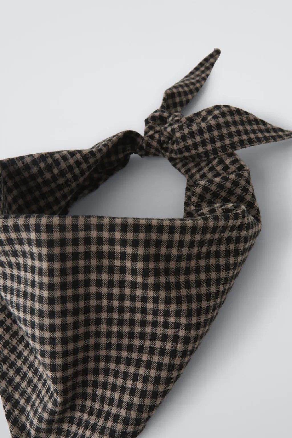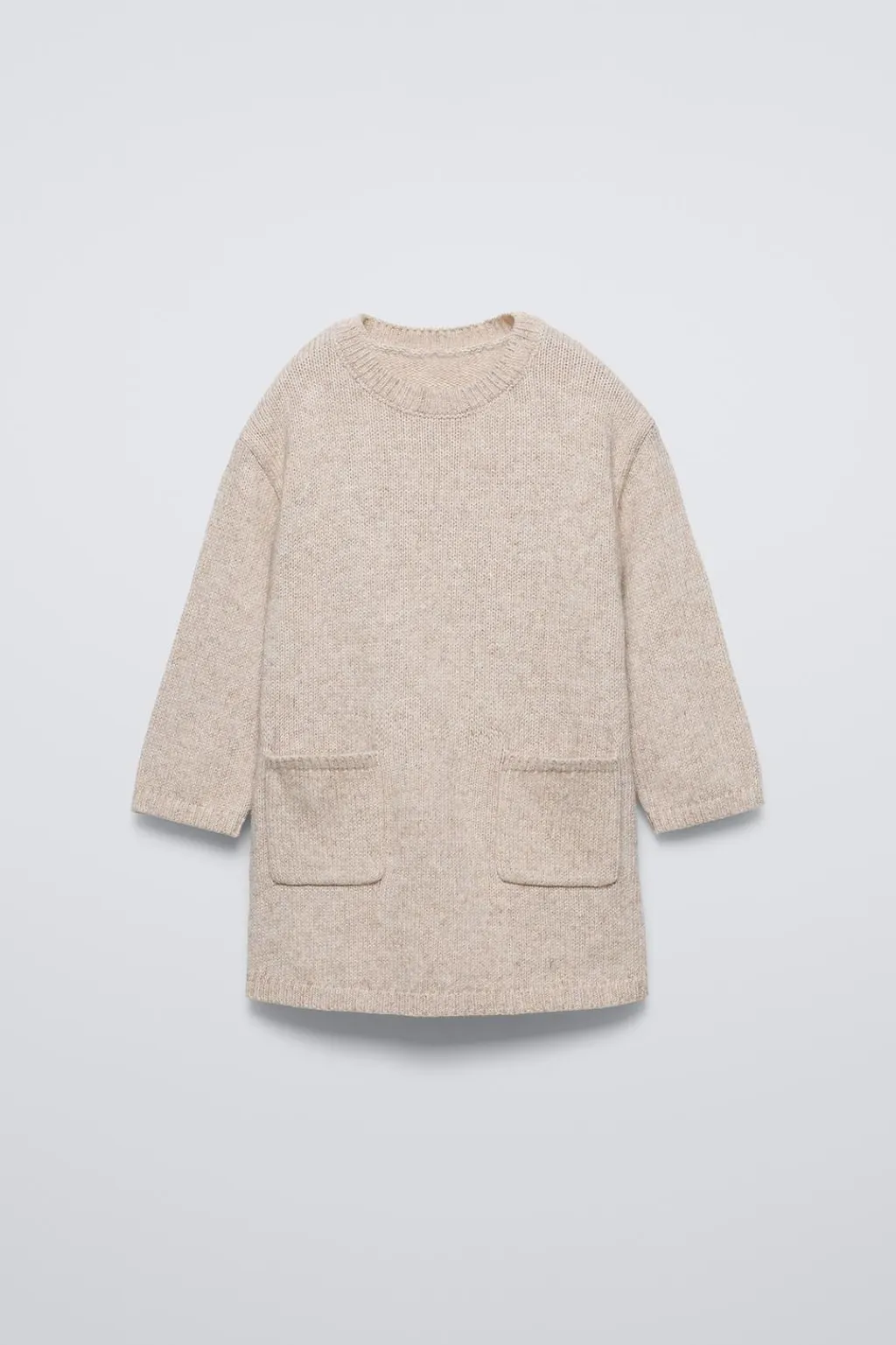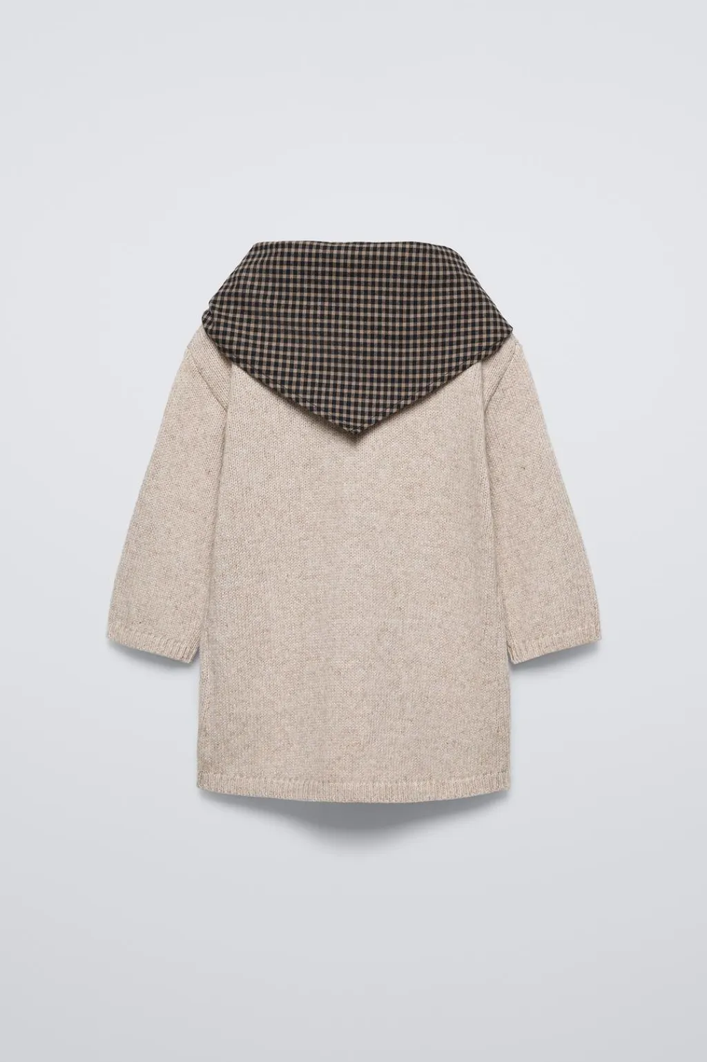 Vestido de punto con cuello redondo y manga larga. Bolsillos de tipo plastrón en delantero. Detalle de pañoleta desmontable con estampado cuadros.