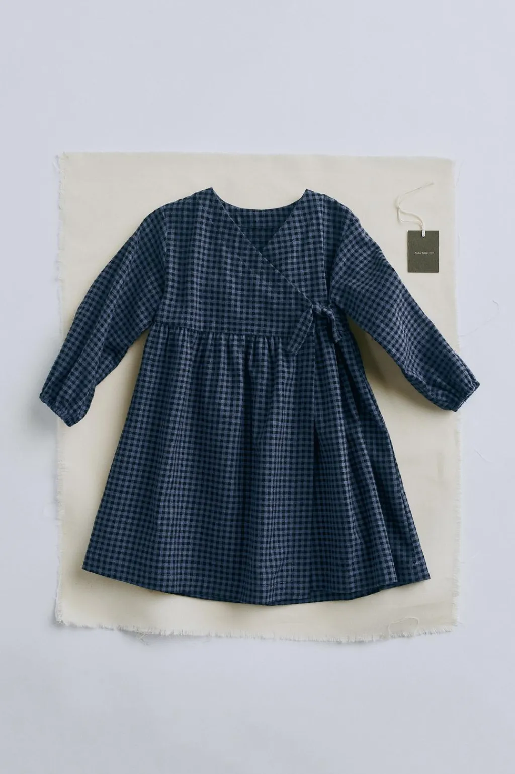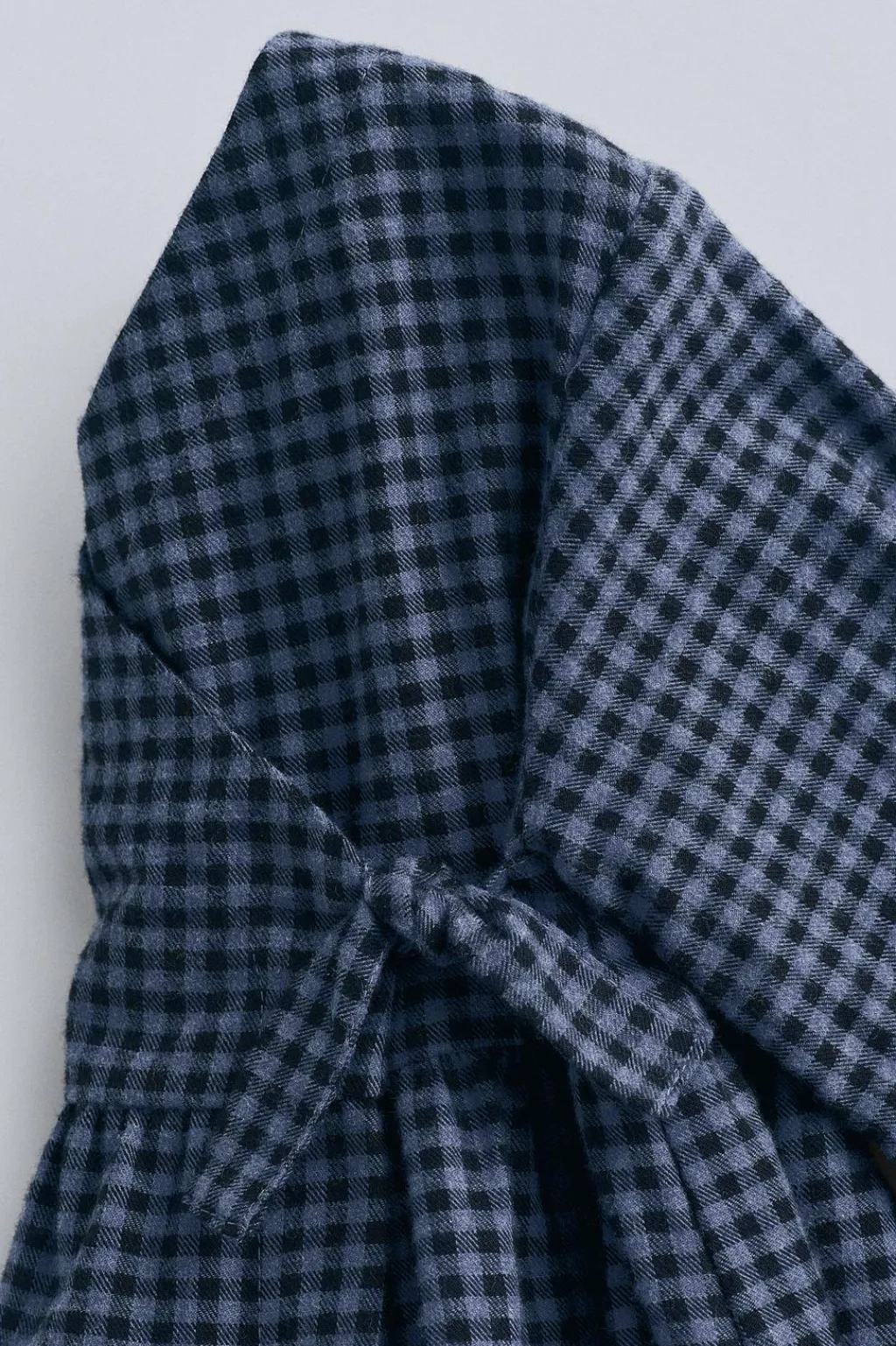 Vestido confeccionado en tejido de algodón con estampado de cuadros vichy. Tiene el cierre cruzado tipo kimono con lazada y botón interior.