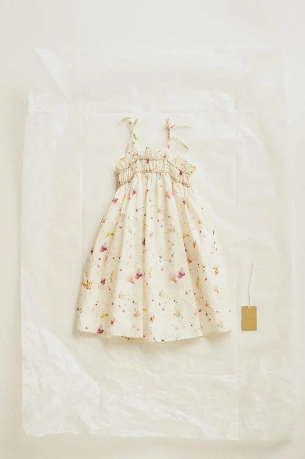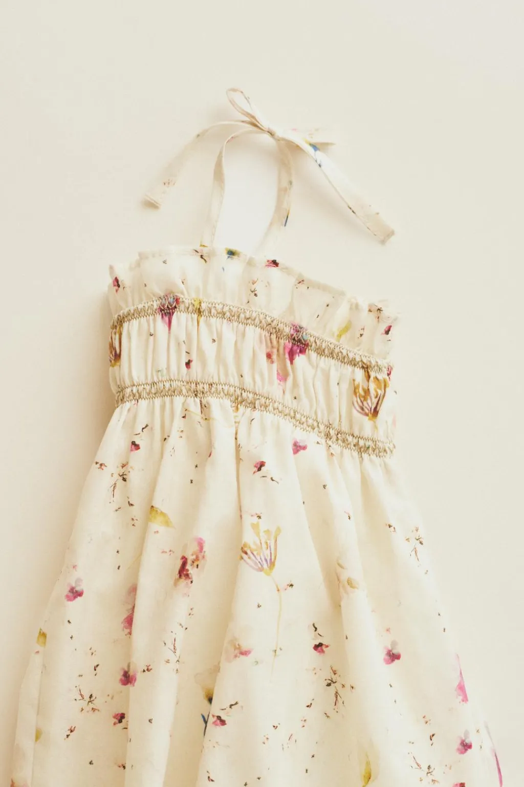 Vestido de tirantes confeccionado en un tejido de algodón con estampado de flores acuareladas. En la parte superior tiene unas gomas con pespunte a contraste que le aportan comodidad.