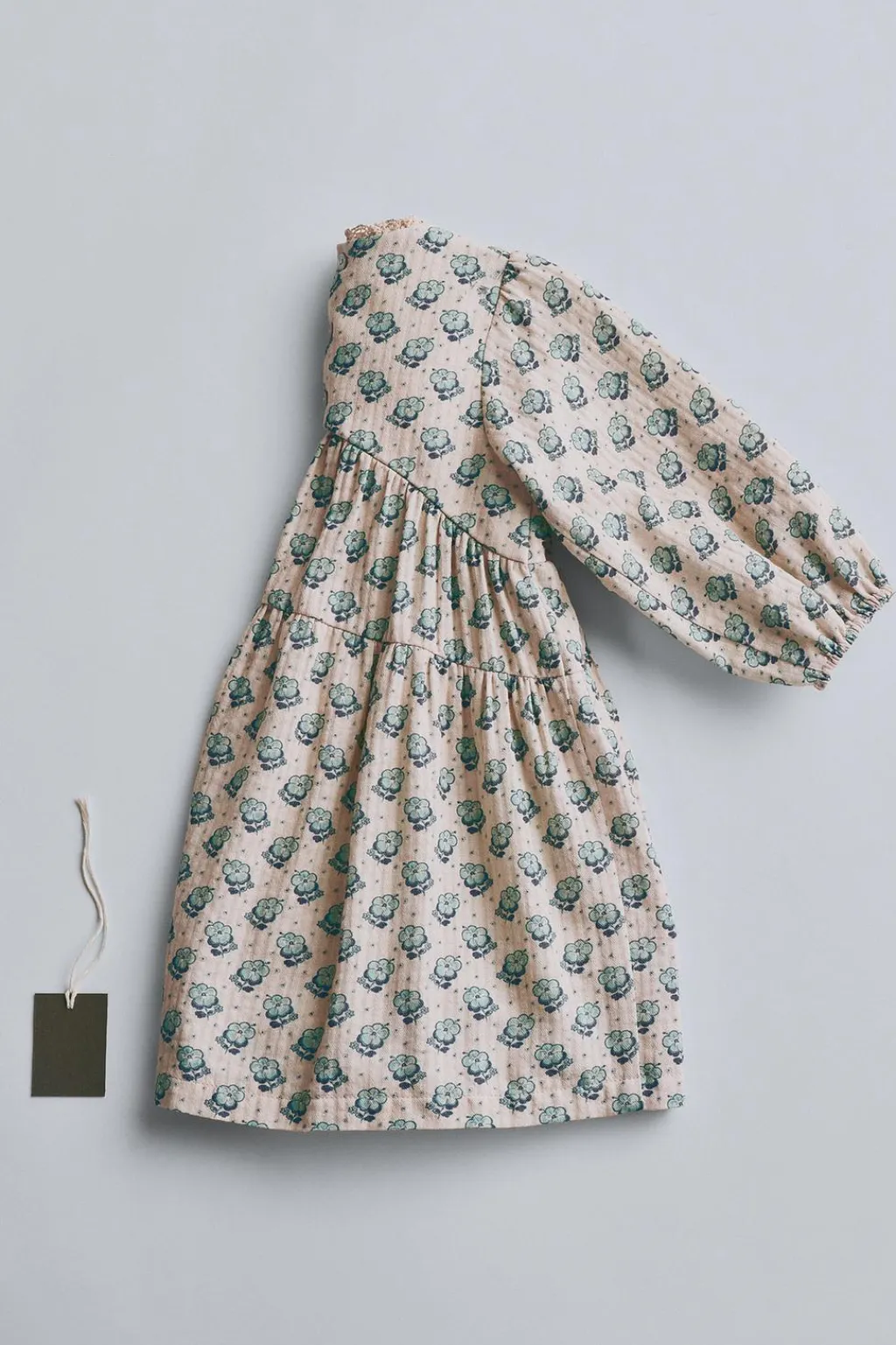 Vestido confeccionado en tejido de algodón con estampado de flores. Las mangas largas acaban en goma para dar comodidad. El detalle está en la puntilla de color a tono en el cuello. El cierre con botones está en la espalda.
