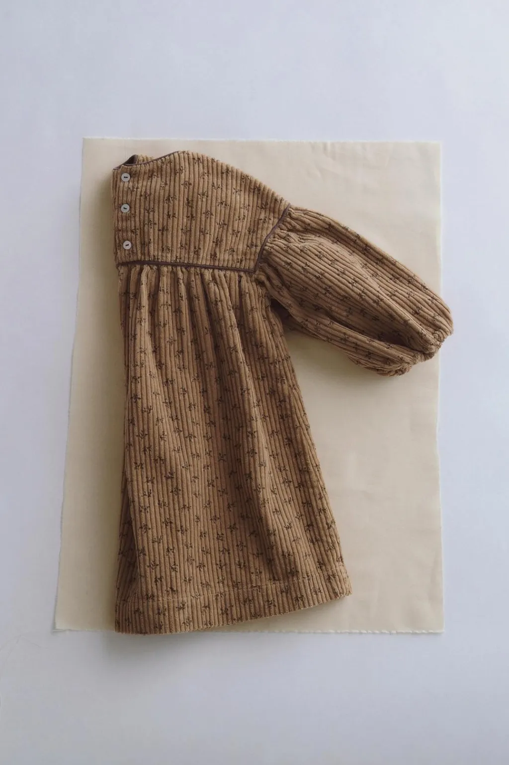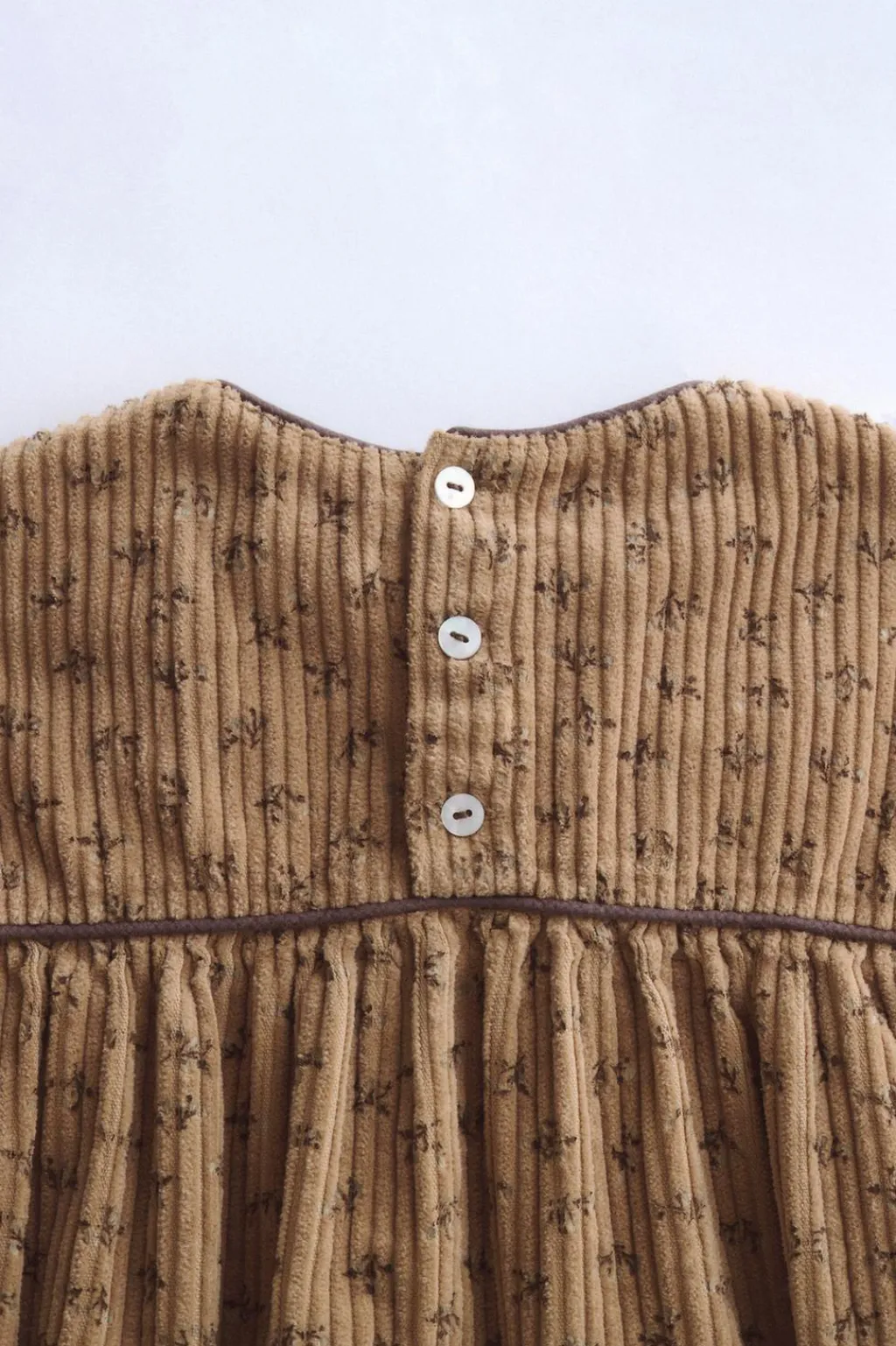 Vestido de pana confeccionado en tejido de algodón con estampado de flores. Las mangas largas acaban en goma para dar comodidad. El detalle está en un vivo color a contraste en el canesú. Tiene cierre con botones en la espalda.