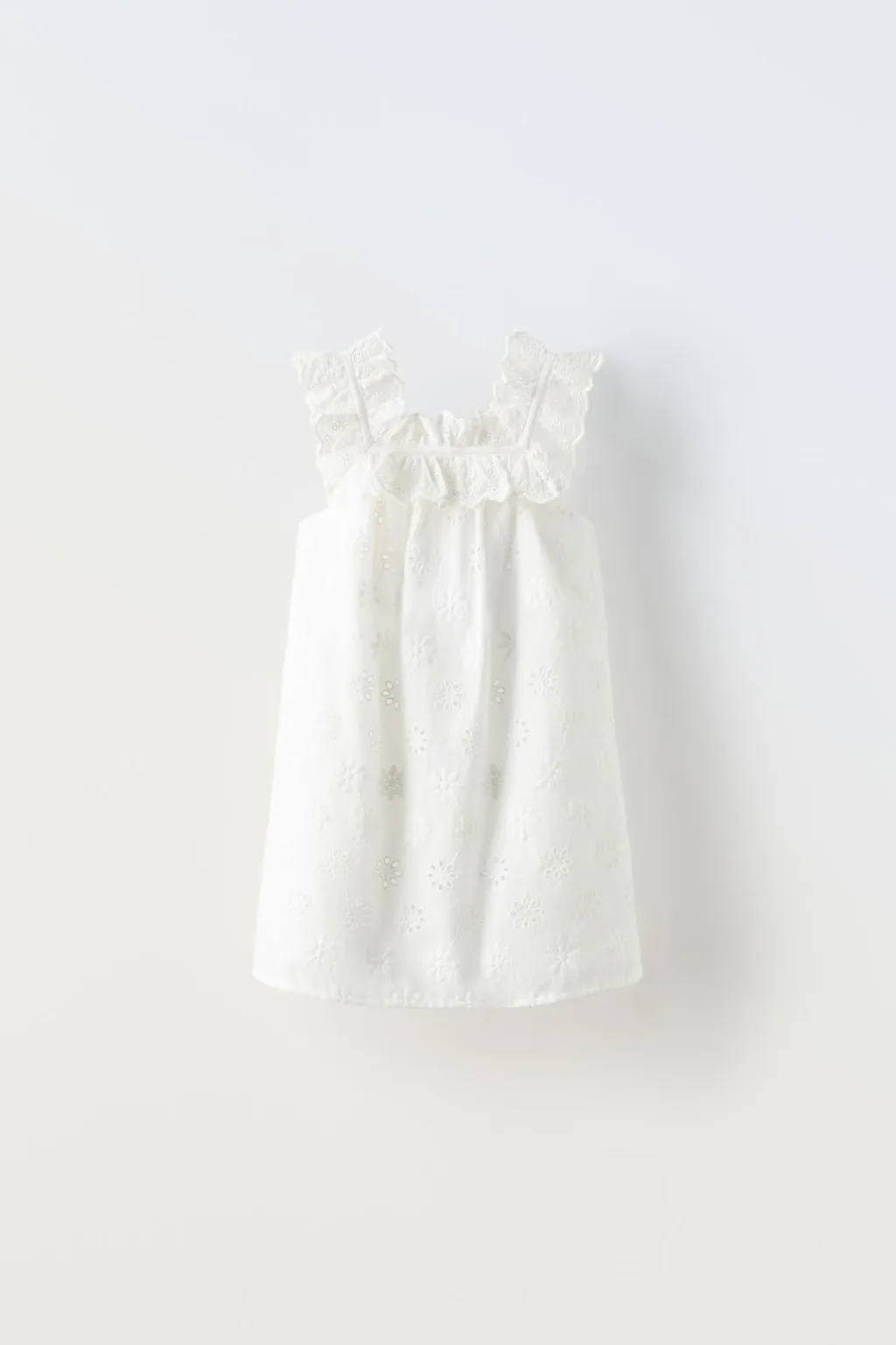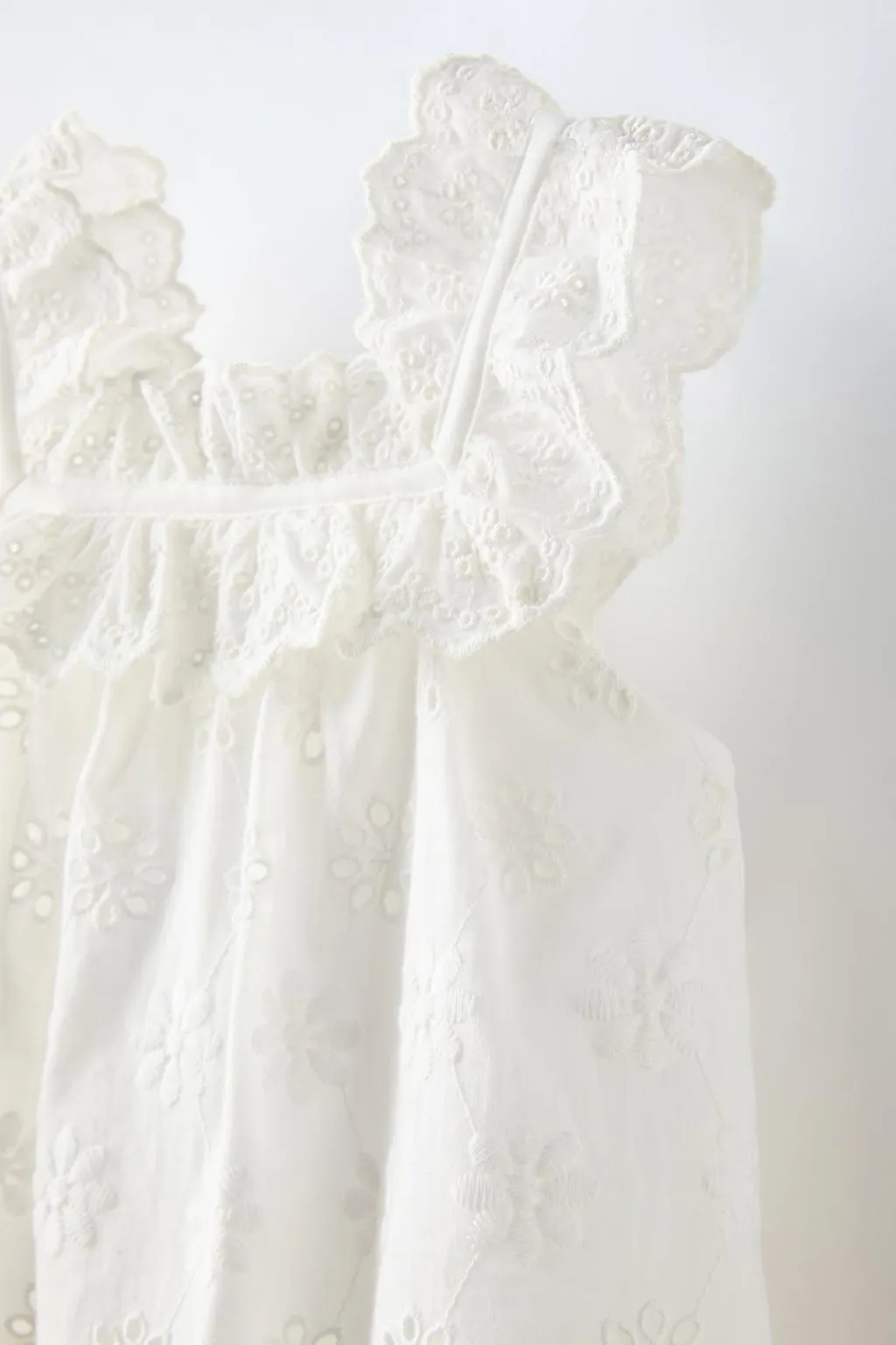 Vestido con cuello recto y tirantes. Aplique volante en cuello y tirantes.Detalle flores bordadas.