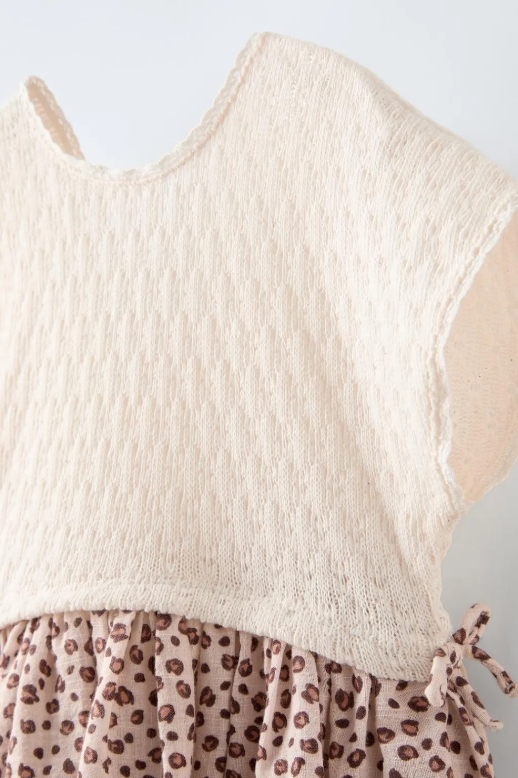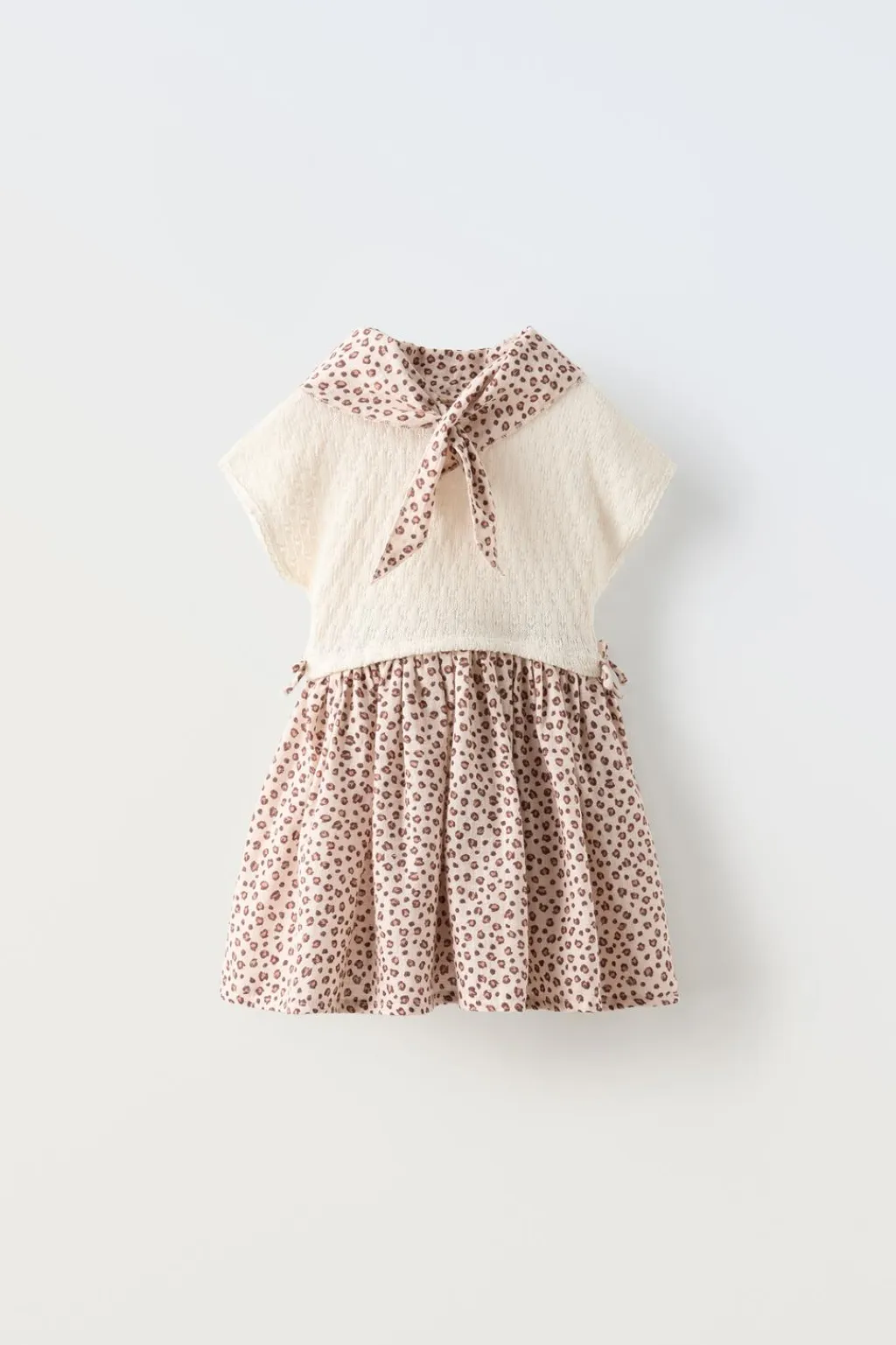 Conjunto de dos piezas. Vestido con cuello redondo y manga corta. Detalle cruzado en espalda. Falda tejido combinado con estampado animal print y aplique lazos en laterales. Bandana triangular con abertura para cierre. Estampado animal print.