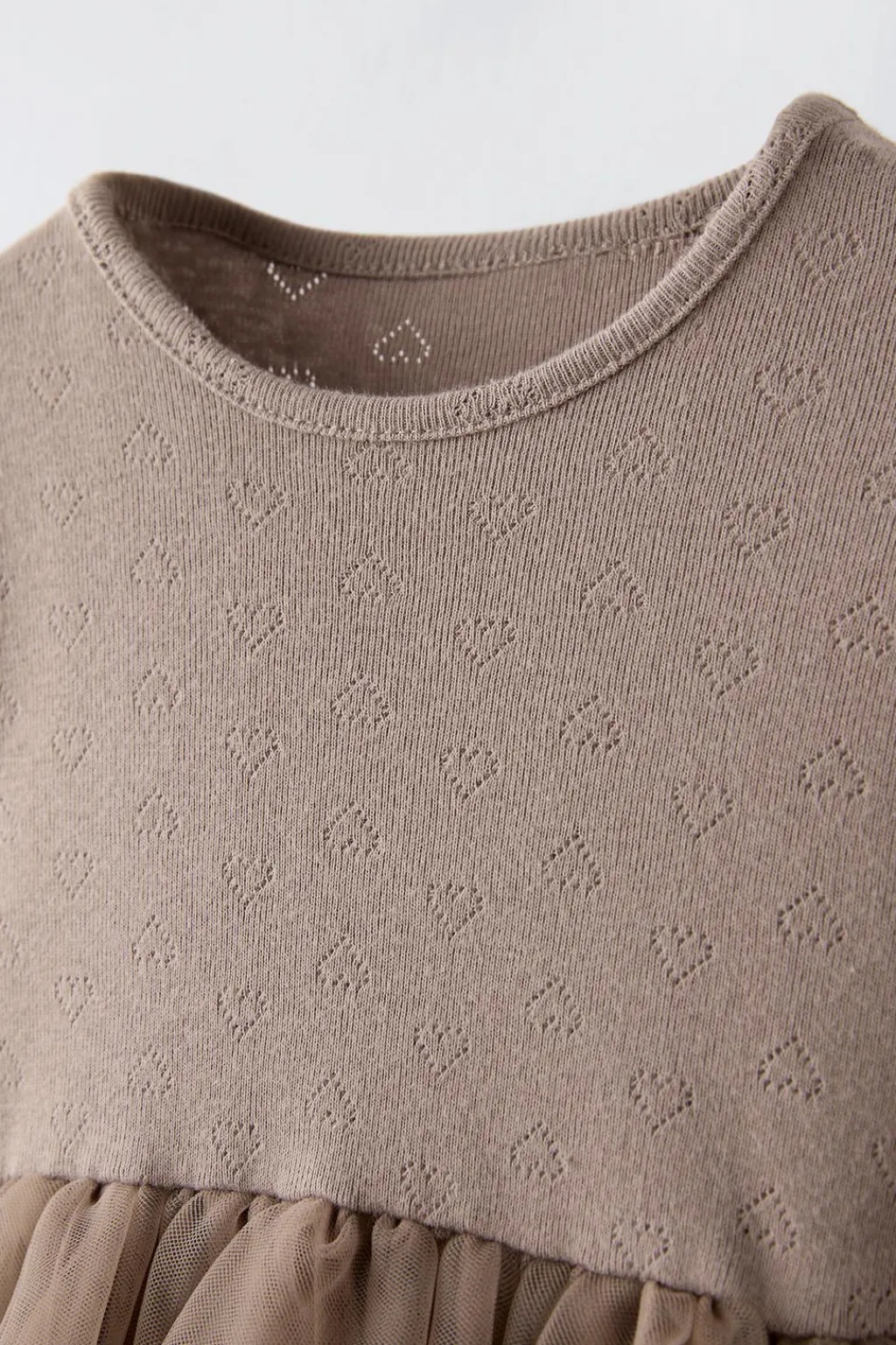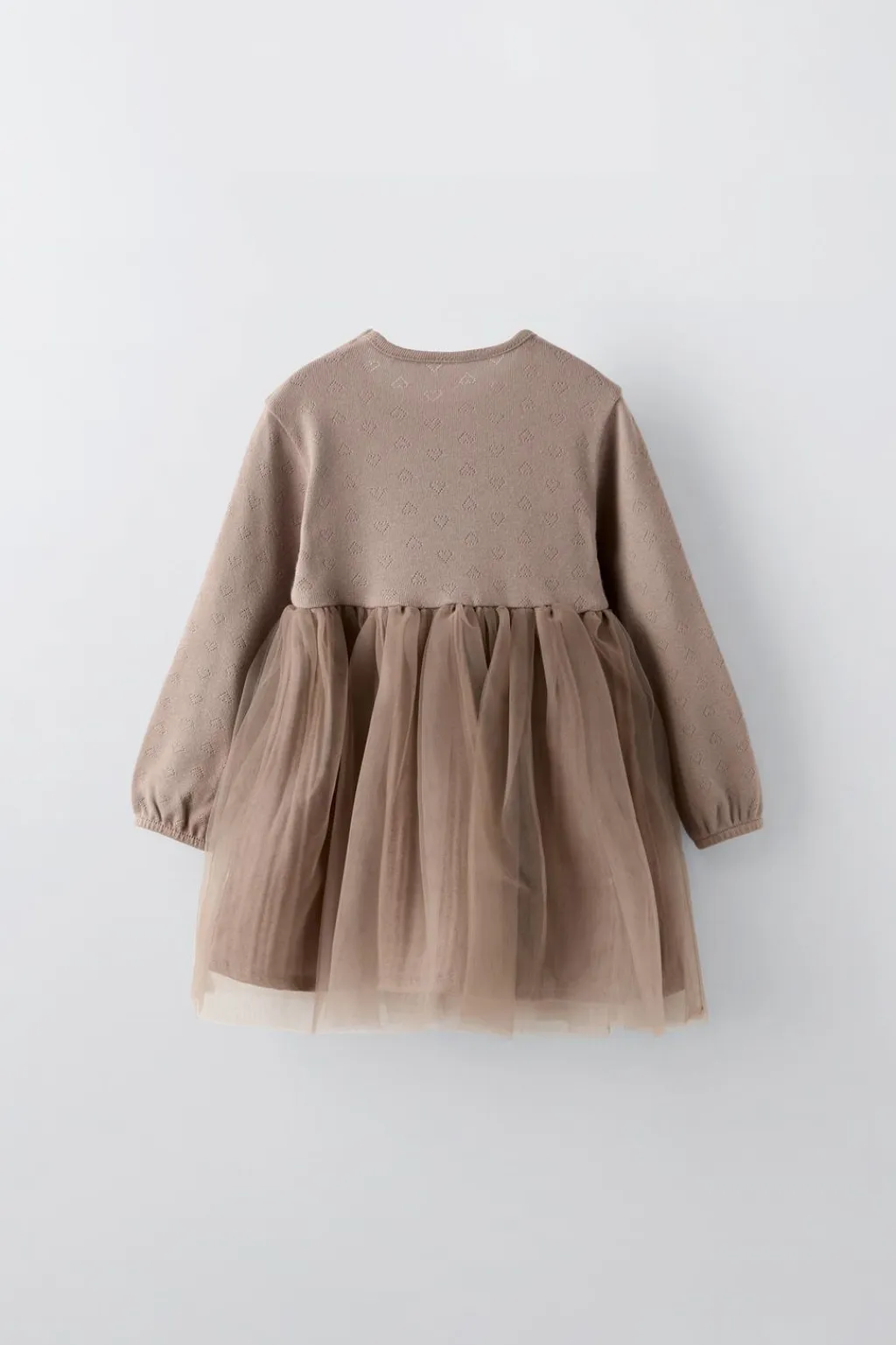 Vestido con cuello redondo y manga larga acabada en goma. Bajo combinado textura y tul.