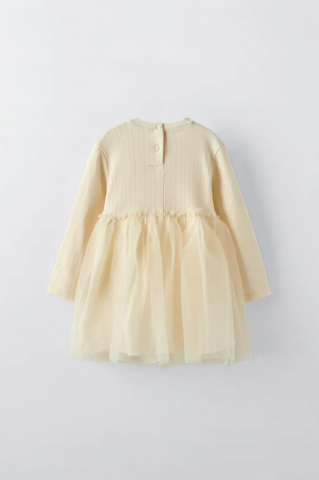 Vestido con cuello redondo y manga larga. Cierre botonadura en espalda. Bajo en tejido tul.