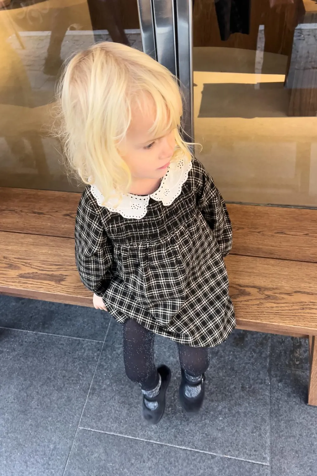 Vestido con cuello bobo bordado y manga larga acabada en goma. Cierre botonadura en espalda. Detalle nido de abeja en pechera.
