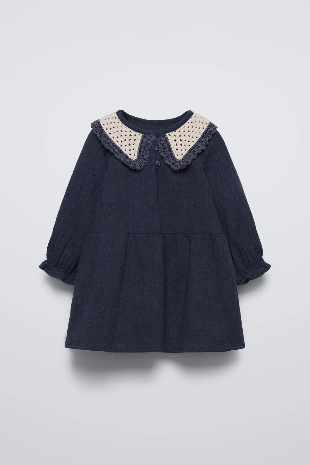 Vestido con cuello bobo crochet y manga larga acabada en goma. Cierre botonadura frontal en canesú.