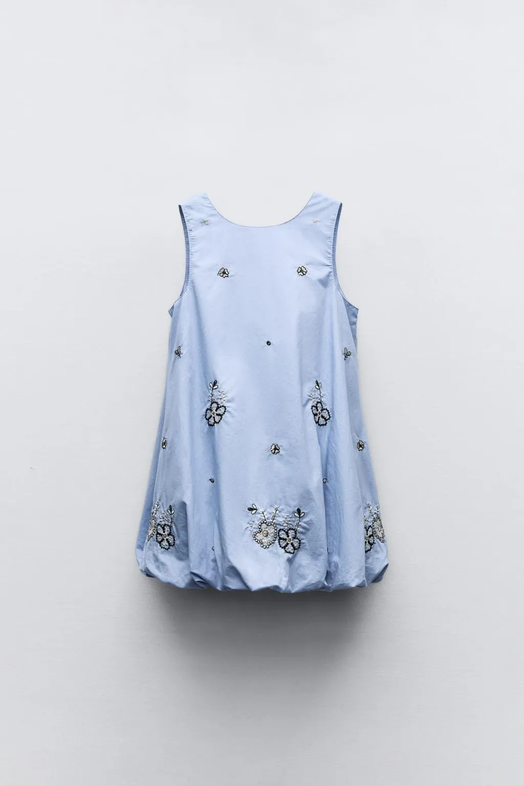 Vestido con cuello redondo y manga sisa. Cierre tipo lágrima en espalda. Motivos bordados con brillo. Bajo tipo globo.