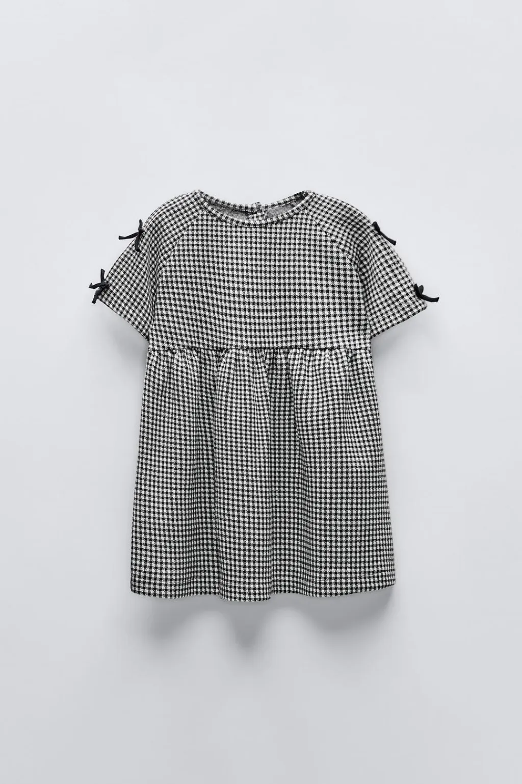 Vestido con cuello redondo y manga corta. Aplique lazos en mangas.