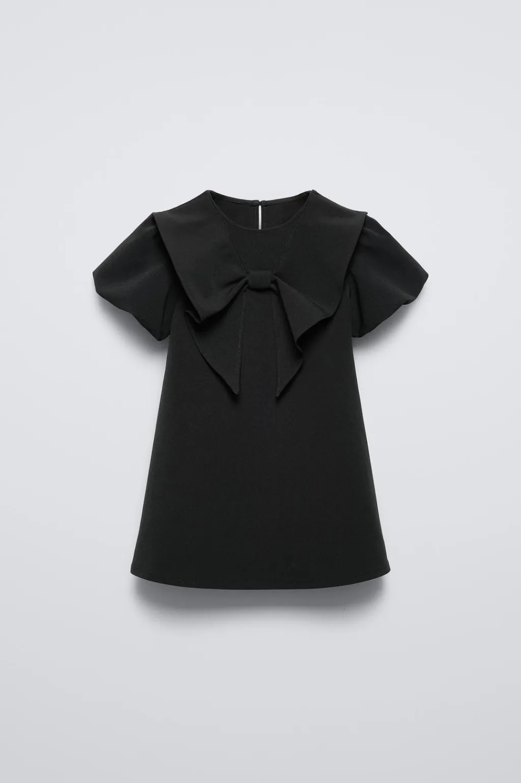 Vestido con cuello redondo y manga corta acabada en globo. Cierre tipo lágrima con botón en espalda. Aplique lazo en pechera.