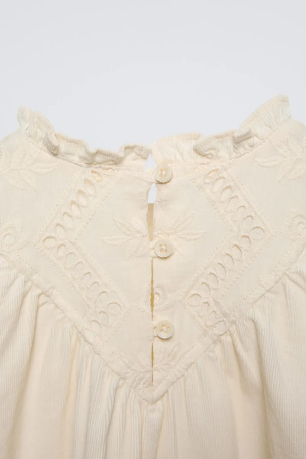 Vestido con cuello redondo y manga larga acabada en goma. Cierre botonadura en espalda. Detalle bordados en pechera y espalda.