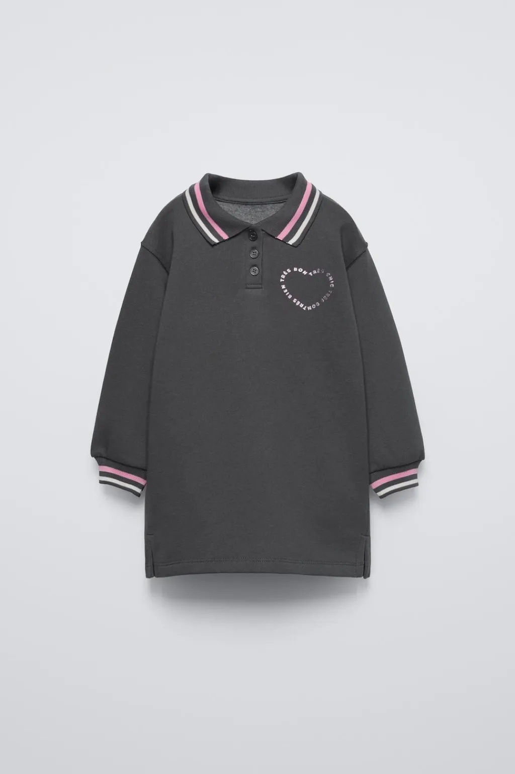 Vestido con cuello tipo polo y manga larga acabadas en rib. Cierre con botones frontal en canesú. Estampado texto en pechera.