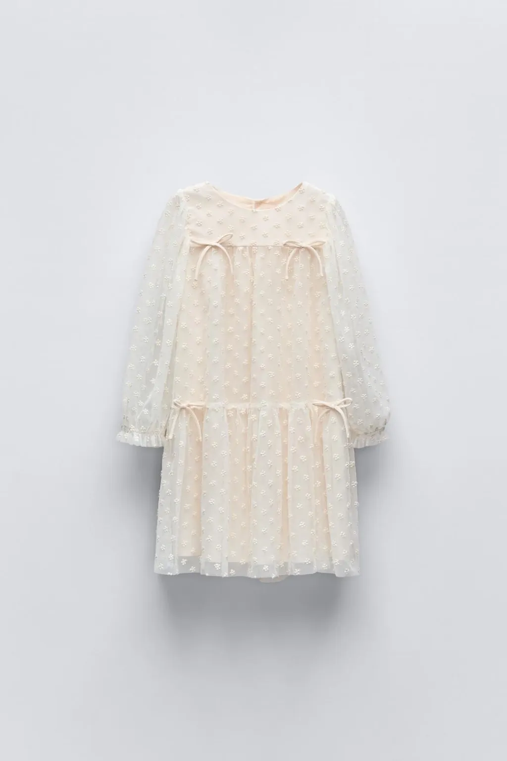 Vestido con cuello redondo y manga larga acabada en goma. Aplique lazos en delantero. Cierre con botones en espalda.