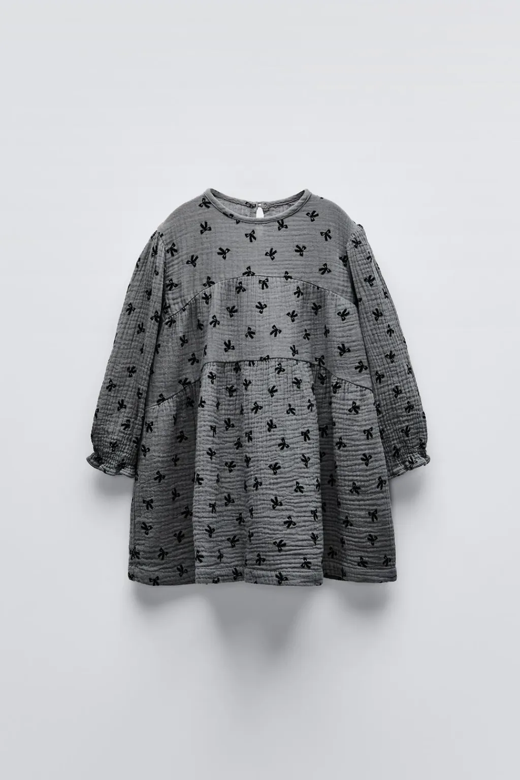 Vestido con cuello redondo y manga larga acabada en goma. Cierre tipo lágrima con botón en espalda.