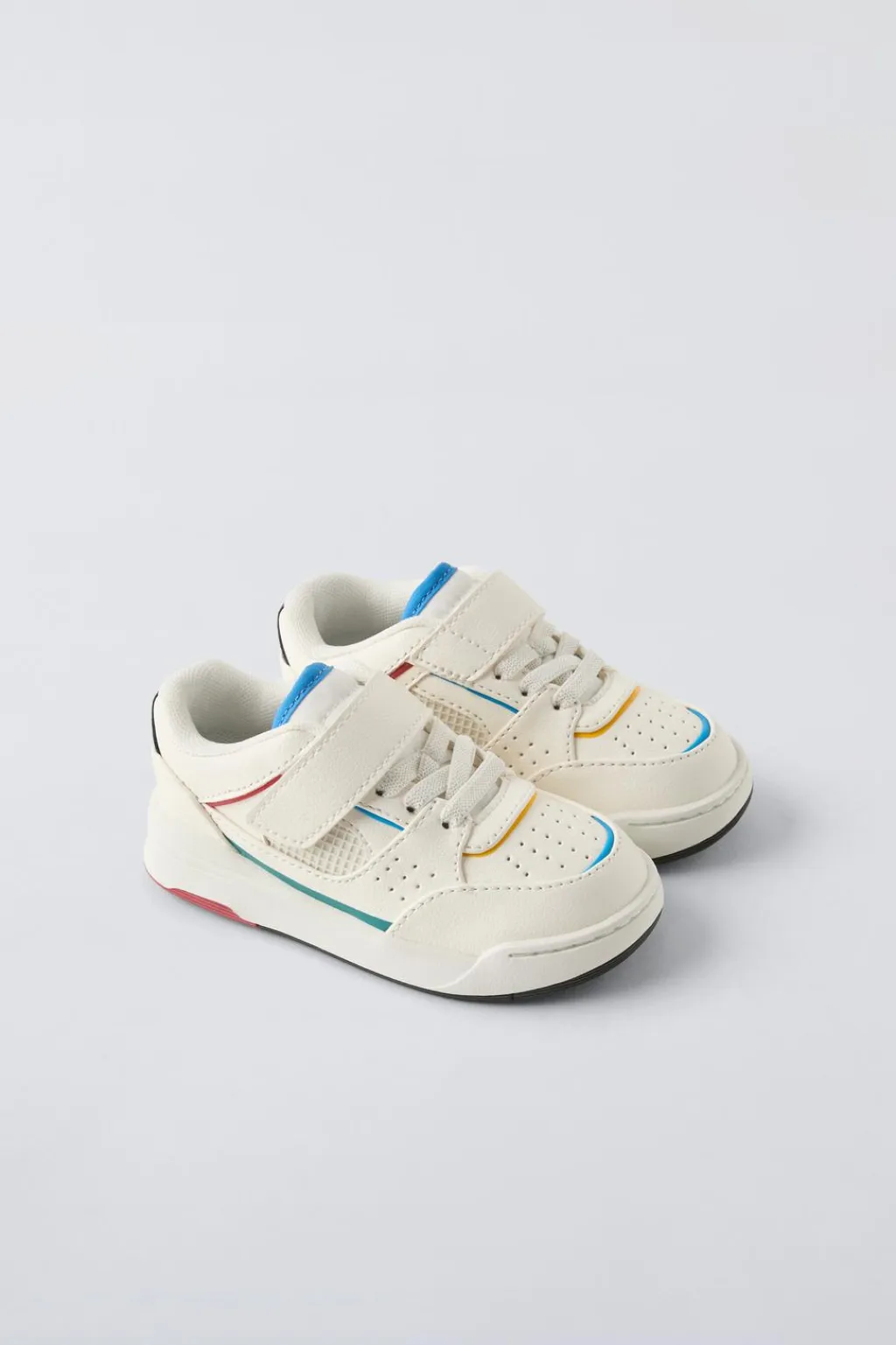 Zapatilla tipo bamba con detalle ribeteado en multicolor. Cierre mediante cordones elásticos y tira adherente. Plantilla flexible. Suela de goma.