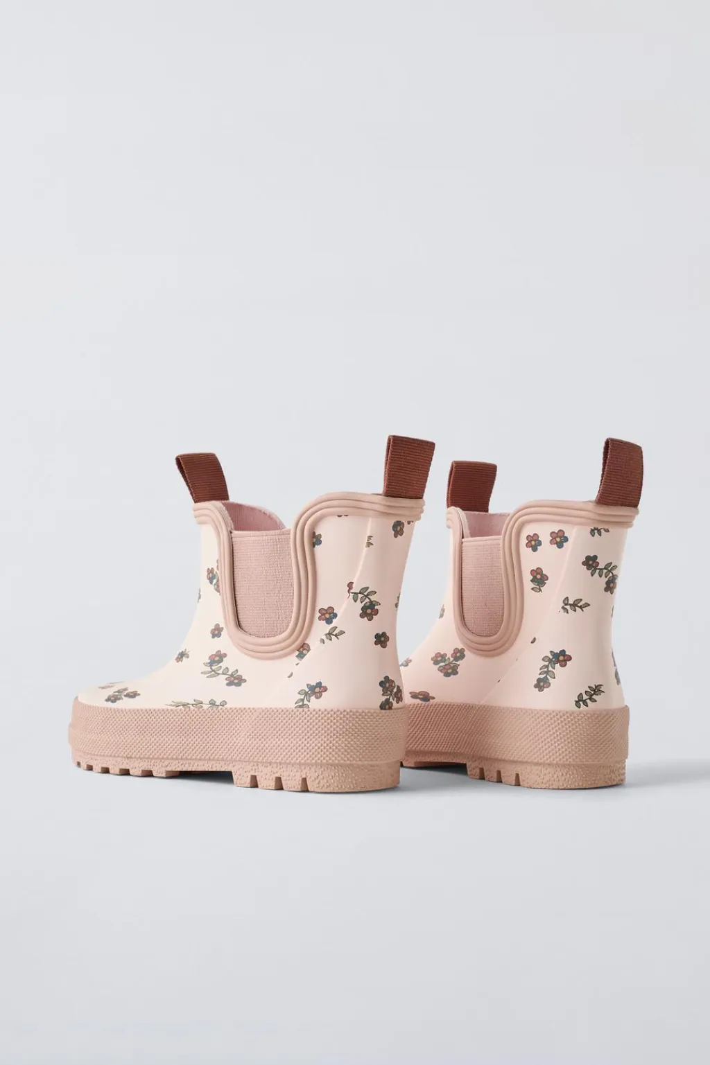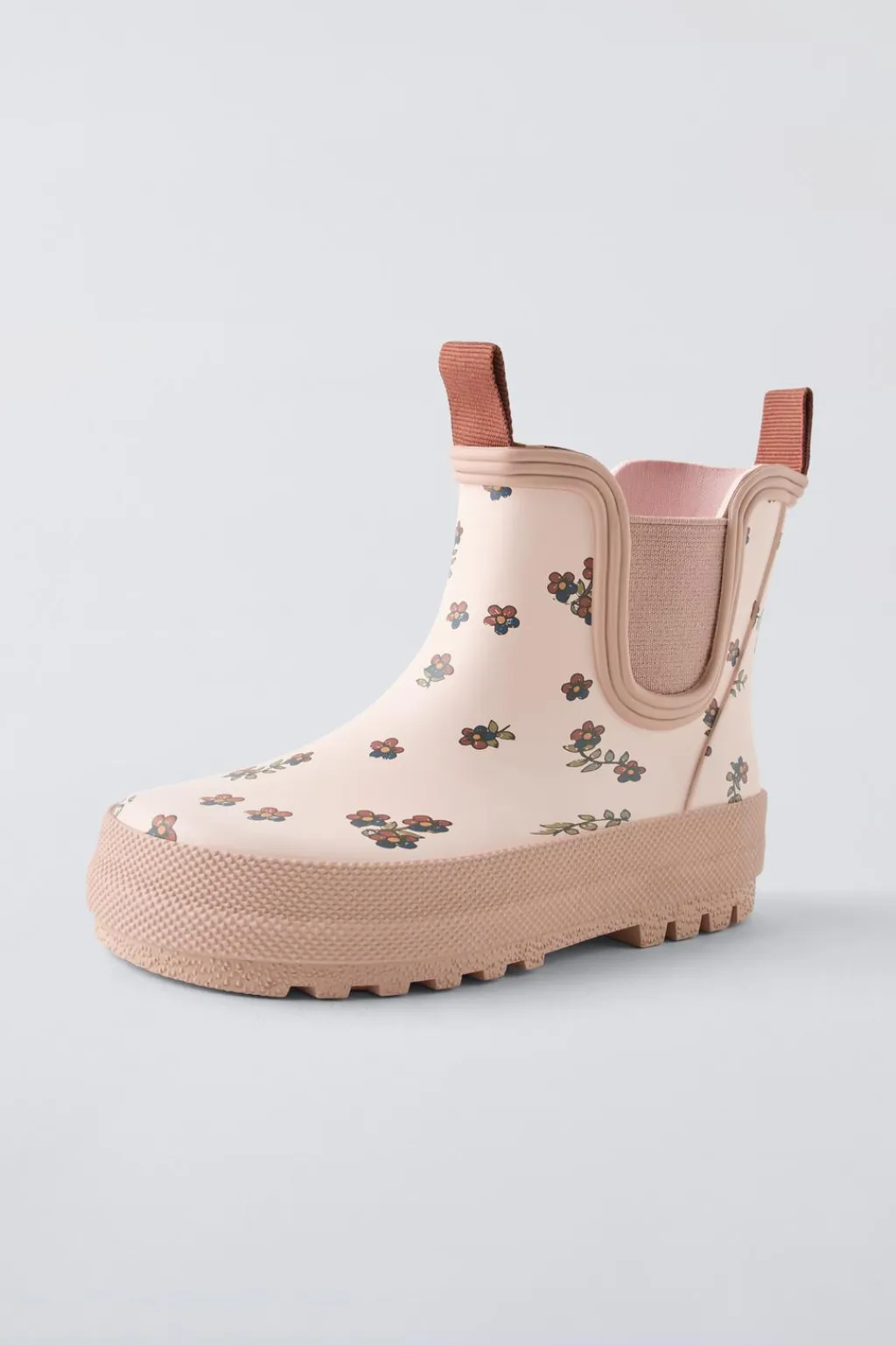 Bota de agua engomada con detalle flores. Cuenta con dos elásticos en los laterales para un mejor calce. Tirador delantero y trasero en contraste de color. Plantilla flexible. Suela de goma en contraste de color.