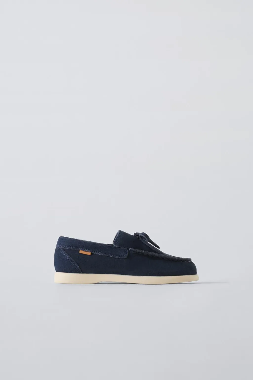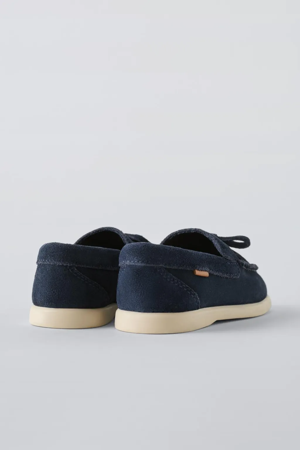 Zapato tipo mocasín estilo náutico 100% piel vacuno acabado en serraje detalle lazo. Plantilla flexible 100% piel caprina. Forro interior 100% algodón. Suela de goma en contraste de color.