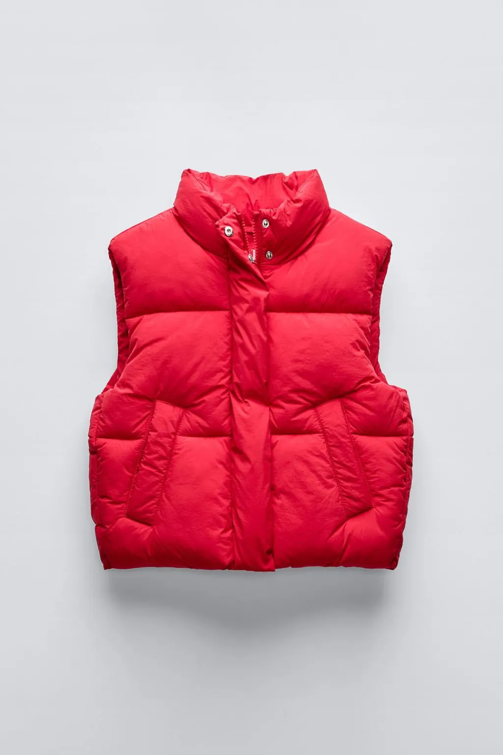 Chaleco con cuello subido y manga sisa. Cierre frontal con botones tipo presión ocultos y cremallera. Bolsillos en delantero.