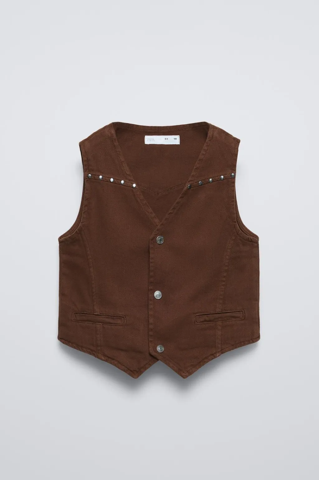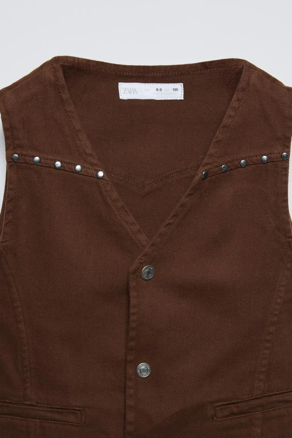 Chaleco con cuello pico y manga sisa. Cierre botones de tipo presión frontal. Detalle falso bolsillo en delantero. Aplique tachas en pechera y espalda.