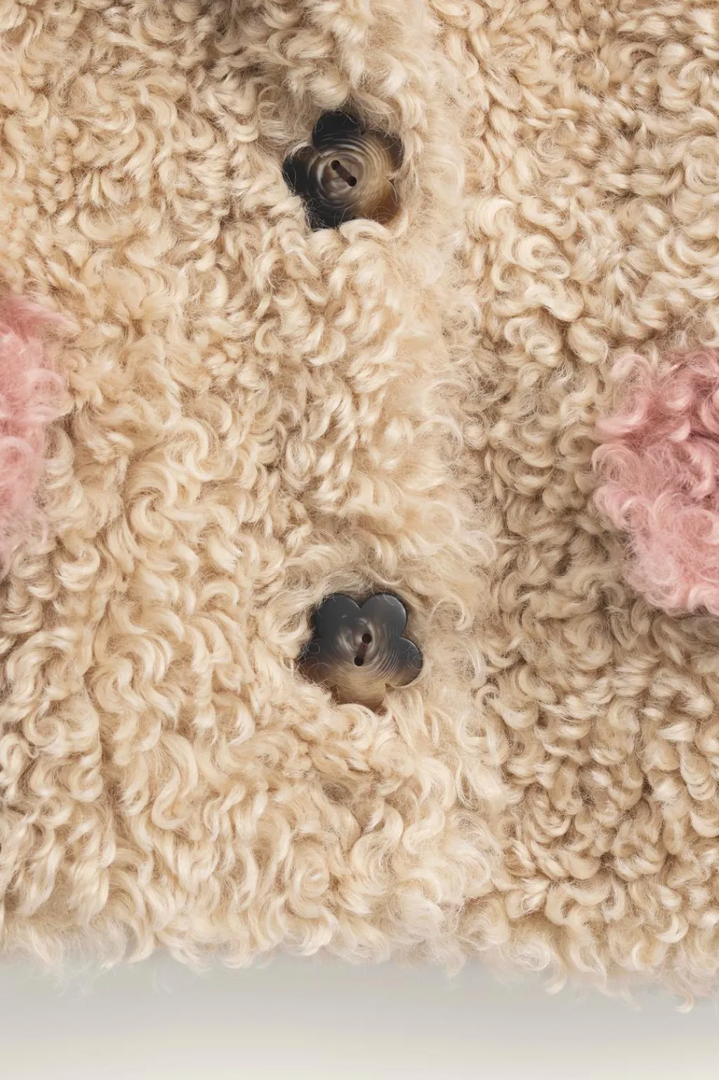Abrigo de borreguillo con cuello solapas y manga larga. Cierre botonadura frontal en forma de flor. Bolsillos de tipo plastrón con tapeta en delantero. Forro interior en estampado flores.