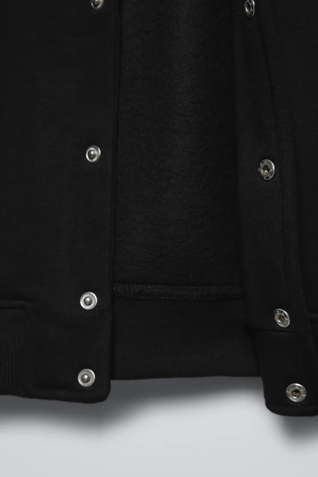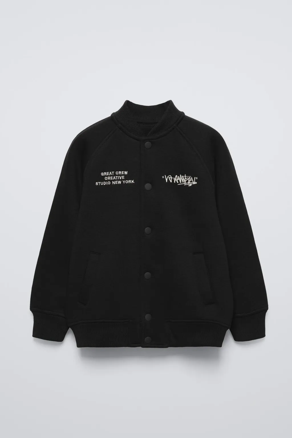 Bomber con cuello pico y manga larga acabada en puño. Cierre botonadura frontal de tipo presión. Bolsillos delanteros con detalle vivo. Detalle texto bordado en pechera y espalda.