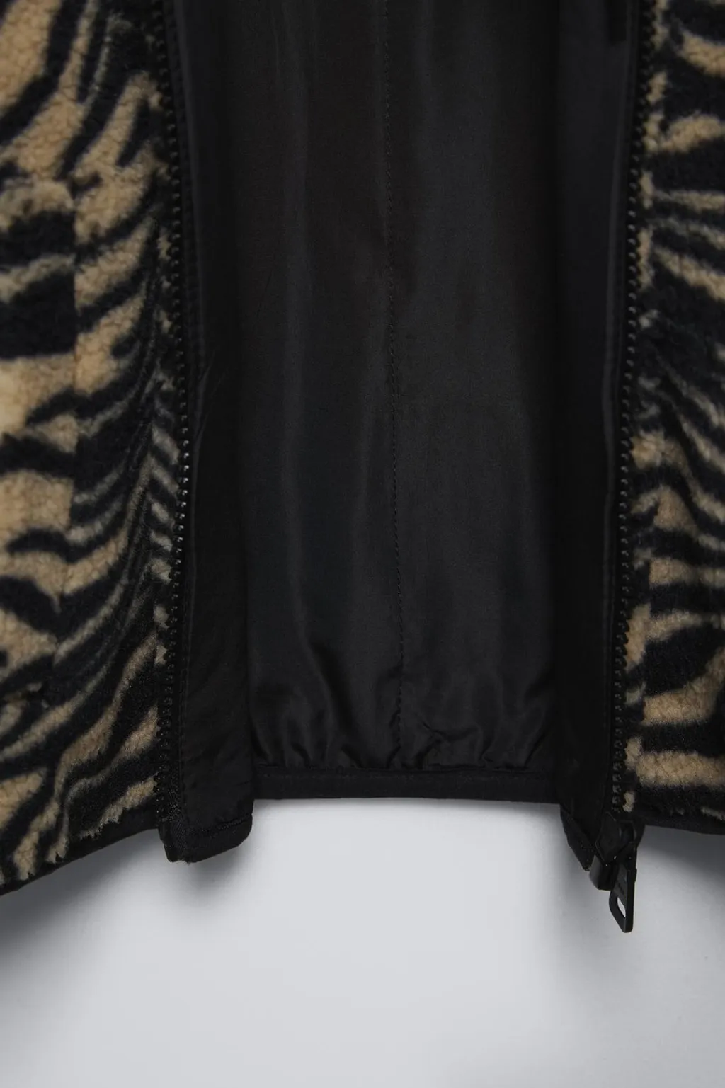 Cazadora de borreguillo con cuello subido y manga larga acabada en goma. Cierre cremallera frontal. Bolsillos delanteros con detalle vivo.