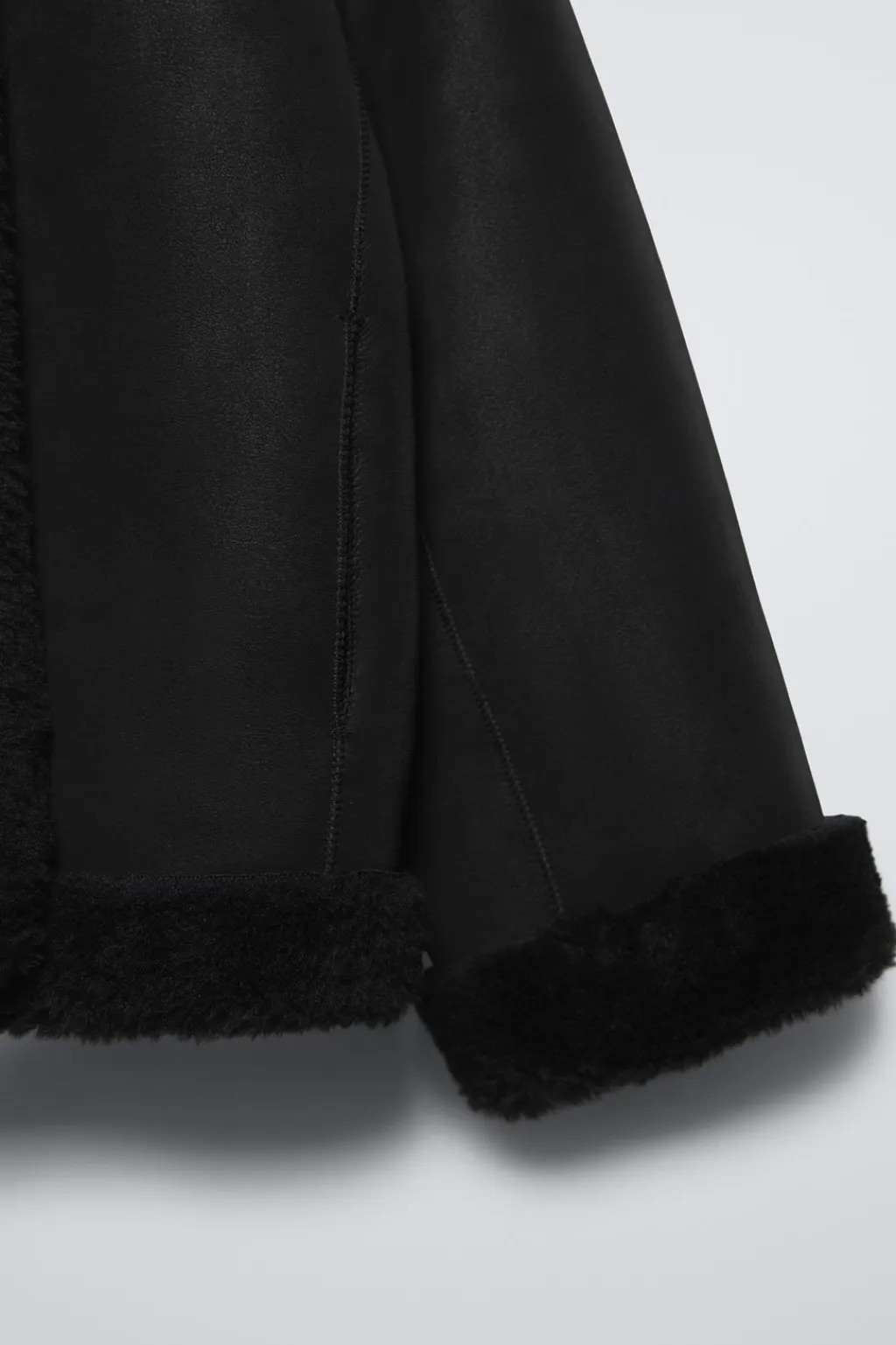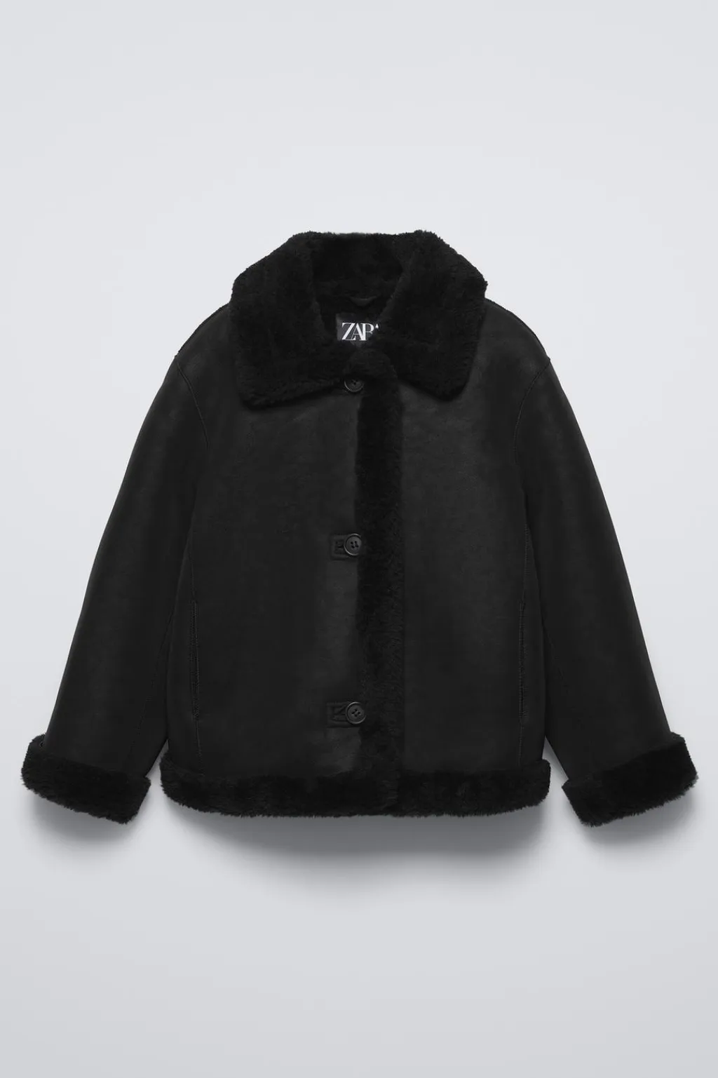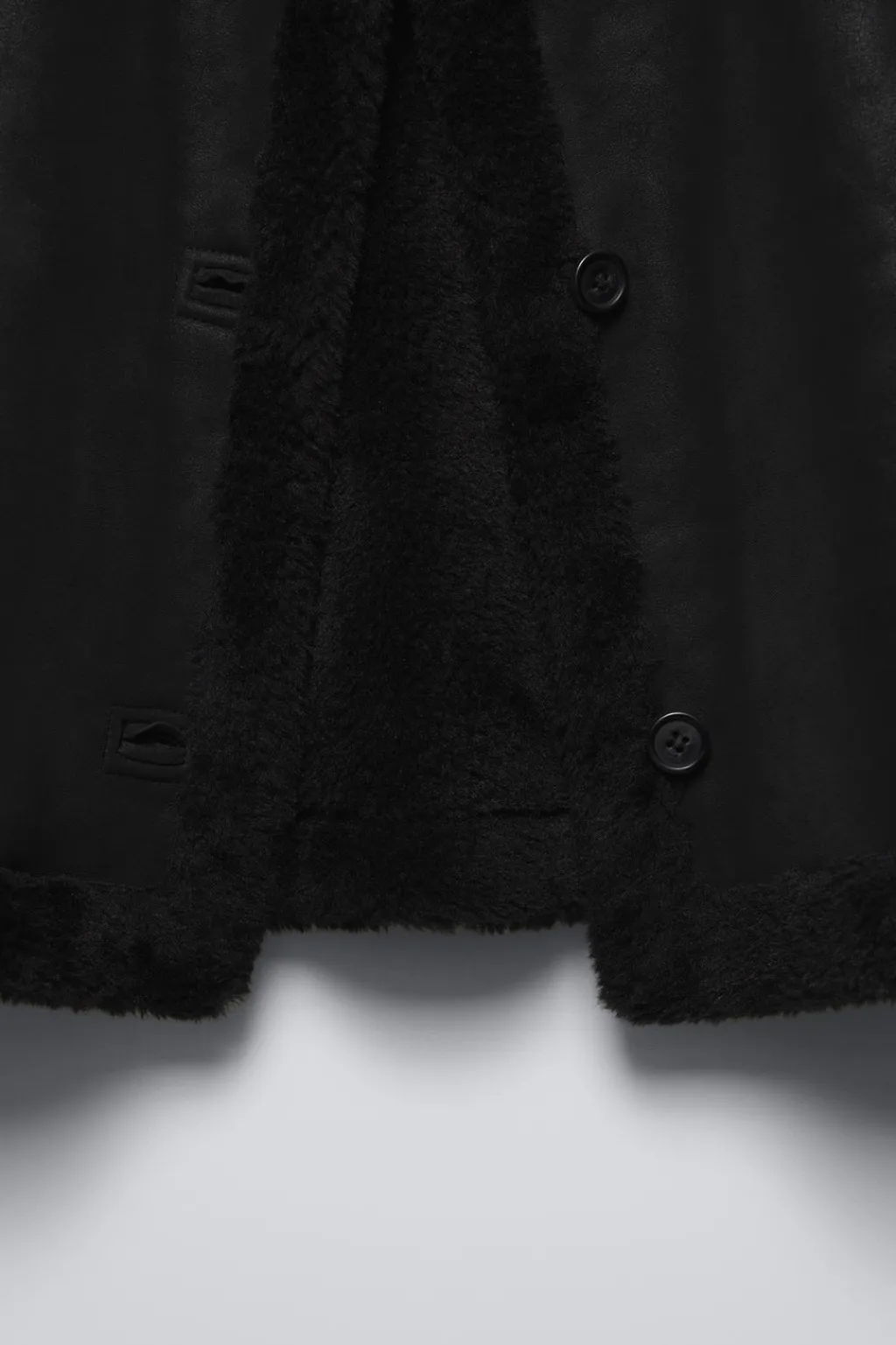 Cazadora con cuello camisero y manga larga acabada en vuelta. Cierre botonadura frontal. Bolsillos delanteros ocultas por costura. Tejido interior efecto pelo.