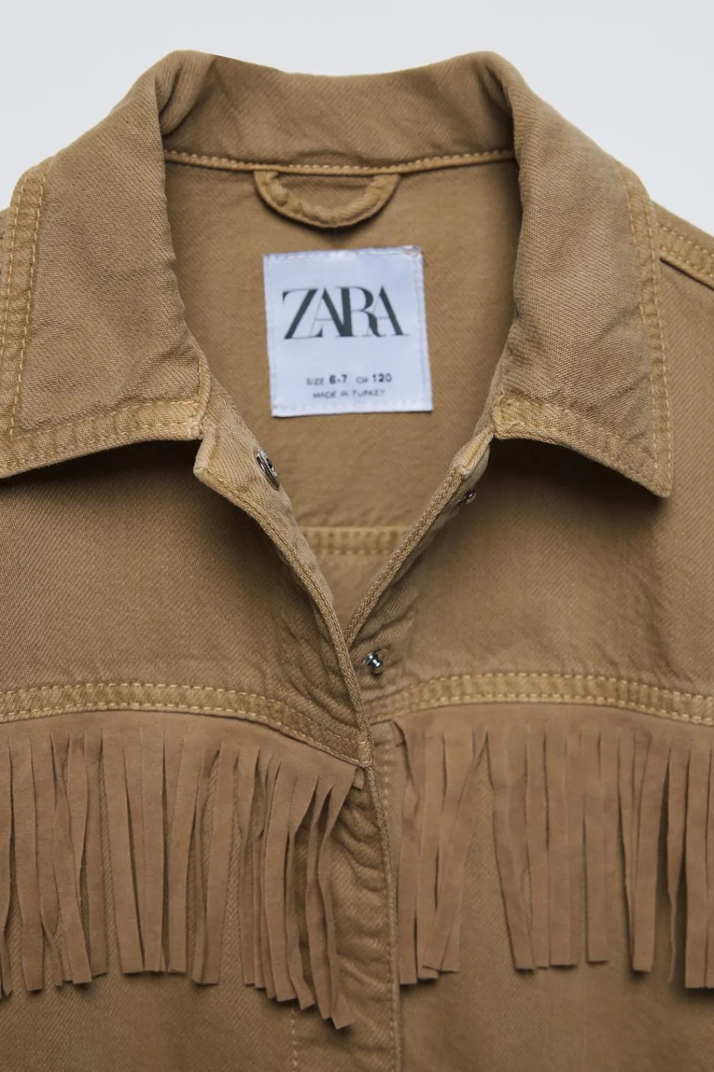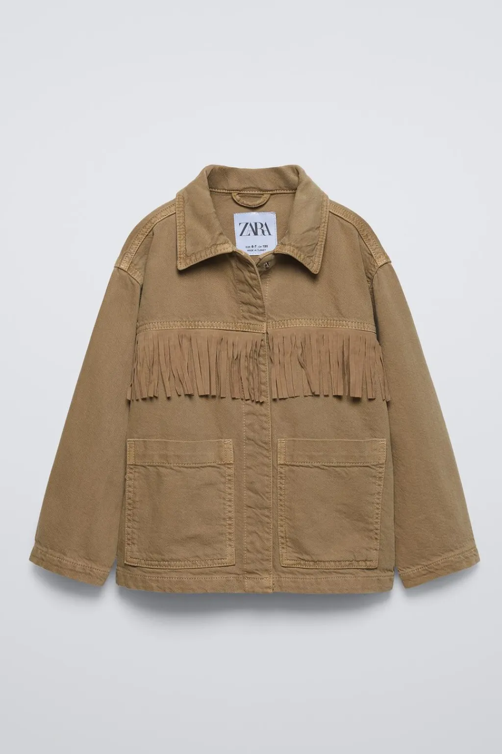 Cazadora con cuello camisero y manga larga. Cierre botonadura frontal de tipo presión ocultos. Bolsillos delanteros de tipo plastrón. Aplique flecos en pechera, espalda y mangas.