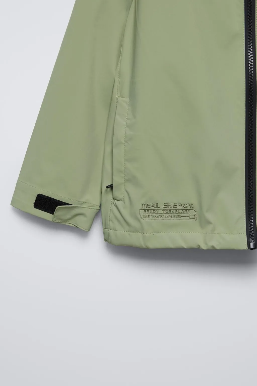 Chubasquero con capucha y manga larga ajustable en puño con autoadhesivo. Cierre frontal con cremallera termosellada. Bolsillo con cremallera en pechera y delantero. Motivo texto bordado. Bajo ajustable con goma y stoppers.