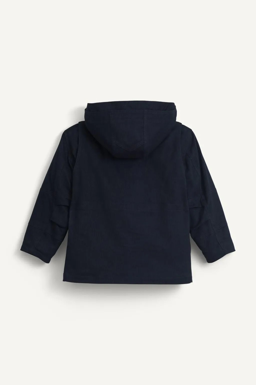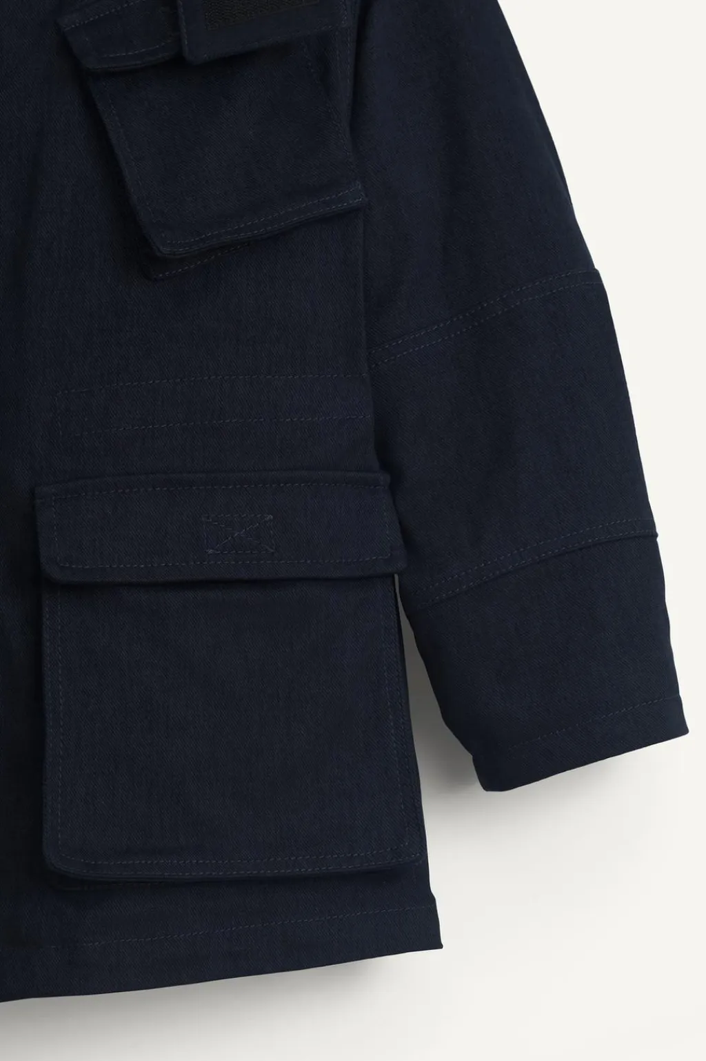 Cazadora tipo cargo, con capucha extraíble por cierre cremallera y cuello subido con cierre adhesivo. Manga larga y cierre cremallera frontal oculta por solapa con cierre de botones tipo presión. Bolsillos de tipo plastrón con tapeta y cierre adhesivo en delantero y pechera. Forro interior de borreguillo.