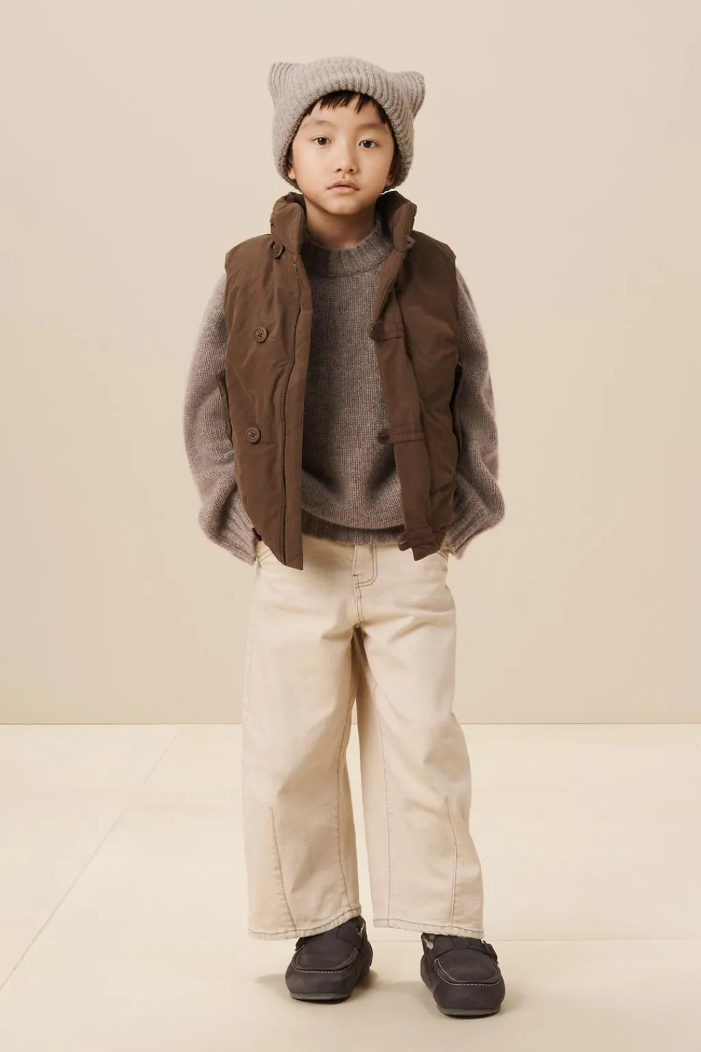 Chaleco acolchado con cuello subido, capucha oculta por cremallera y manga sisa. Cierre cremallera frontal oculta por solapa con cierre botones y detalle tiras. Bolsillos delanteros con tapeta y cierre botón presión. Forro interior combinado a tono.