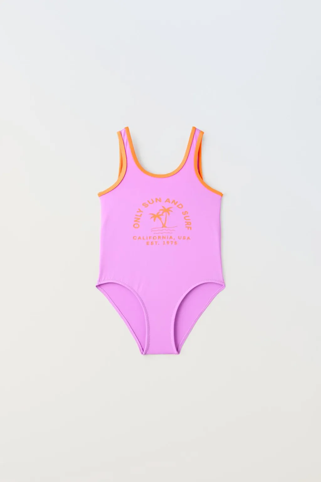 Bañador con cuello redondo y tirantes. Estampado con texto relieve en delantero. Acabados en vivos a contraste.
