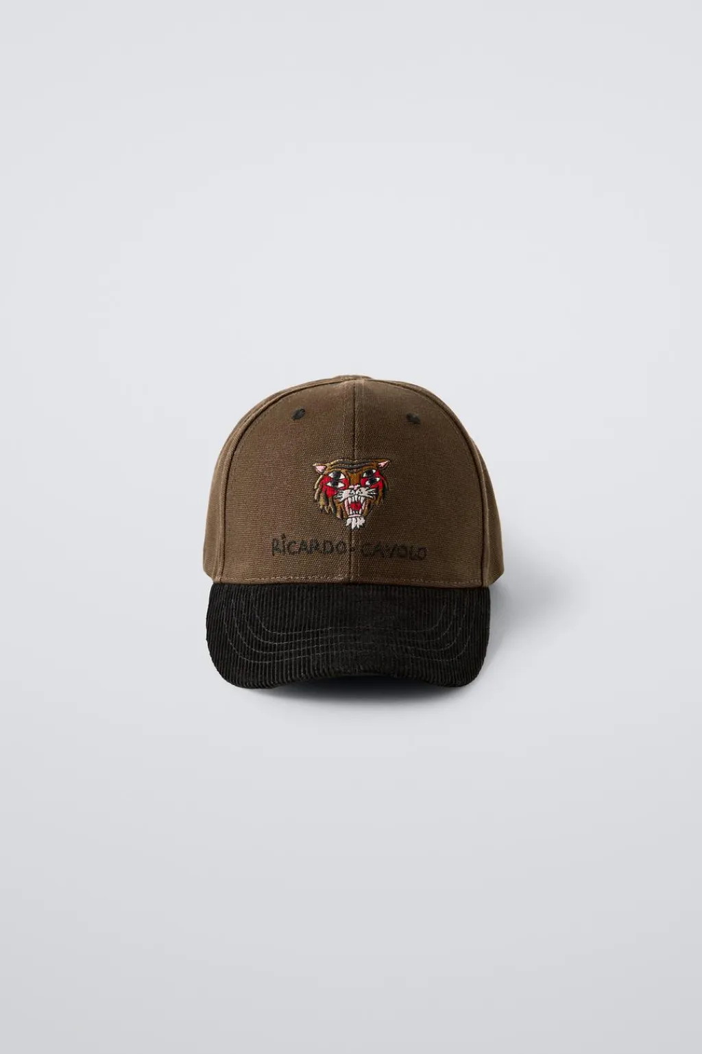 Gorra con cierre adhesivo ajustable en nuca. Tejido pana en visera. Estampado x Ricardo Cavolo en delantero.