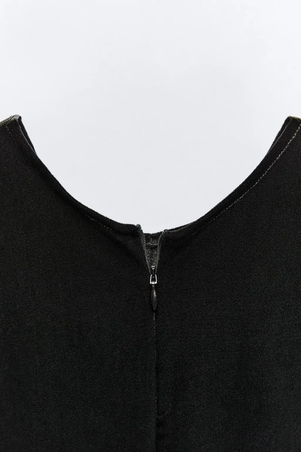 Mono de terciopelo con cuello redondo y manga larga. Cierre con cremallera en espalda. Aplique capa con autoadhesivos en hombro y mangas.